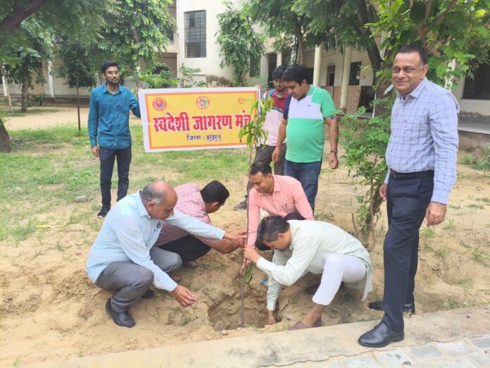 जिला मुख्यालय पर स्थित राजकीय राधेश्याम आर मोरारका महाविद्यालय में स्वदेशी जागरण मंच झुंझुनूं के बैनर तले एक शिक्षक एक वृक्ष की थीम पर 51 पौधे लगाए। राष्ट्रीय स्वंयसेवक संघ के विभाग प्रचारक मुकेश कुमार ने कहा पेड़ लगाओ खुशहाली पाओ और पंच परिवर्तन की दिशा में कदम बढ़ाओं। सभी शिक्षकों ने इस वर्ष पांच-पांच पौधे लगाकर संरक्षण करने का संकल्प लिया। इस अवसर पर प्राचार्य प्रो. सुरेन्द्र सिंह, जिला सचिव डॉ. विकास भड़िया, इकाई सचिव प्रो. मानसिंह मान, विचार विभाग प्रमुख स्वदेशी जागरण मंच झुंझुनूं एवं सह-समन्वयक स्वावलम्बी भारत अभियान डॉ. शुभकरण, डॉ. धर्मवीर जानूं एवं डॉ. विकास मील उपस्थित रहे।