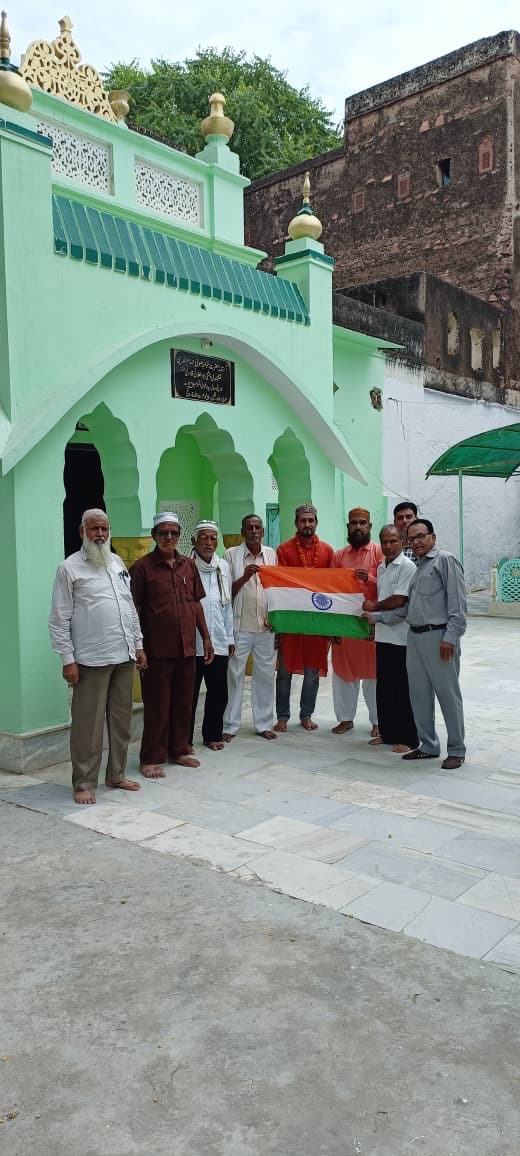 भाजपा अल्पसंख्यक मोर्चे की ओर से प्रधानमंत्री नरेंद्र मोदी के आह्वान पर भाजपा जिलाध्यक्ष एवं जिला प्रमुख हर्षिनी कुलहरि के निर्देश अनुसार 15 अगस्त के उपलक्ष्य में हर घर तिरंगा अभियान वितरण कार्यक्रम को लेकर भाजपा अल्पसंख्यक मोर्चे के जिलाध्यक्ष शौकत अली चौहान ने मोहल्ला पीरजादान में स्थित दरगाह तारकीन हजरत ख्वाजा सूफी कमालुद्दीन चिश्ती में पीर मोहम्मद अमानतुल्लाह फारुकी की सदारत में हर घर तिरंगा वितरण कार्यक्रम का आगाज किया। दरगाह में अकीदत के फूल पेश कर मोर्चा कार्यकर्ताओं ने देश मे अमन, चैन और खुशहाली की दुआएं मांगी। इस अवसर पर पीर मोहम्मद अहमद उर्फ कुकू भाई, मोर्चे के जिला महामंत्री रुस्तम अली कांट, लुकमान खान, हाजी अब्दुल रहमान मोम, डॉ. शौकत अली, हाजी मोहम्मद अय्यूब, मोर्चे के नगर मंडल अध्यक्ष खलील सिलावट, शाहिद फारूकी, उस्मान गनी लादूसरिया, जावेद लुहार, हवलदार इकबाल खान सहित अनेक कार्यकर्ता मौजूद थे।