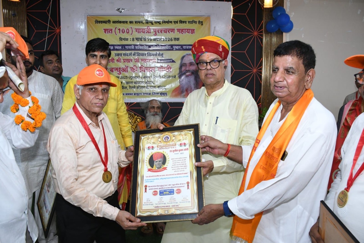 तीर्थराज पुष्कर में अगले वर्ष आठ मार्च से 19 अप्रेल 2026 के मध्य आयोजित होने वाले 200 कुंडीय शत गायत्री पुरश्चरण महायज्ञ के निमंत्रण के लिए विप्र फाउंडेशन द्वारा गुरुवार को पीरू सिह सर्किल स्थित खाना खजाना रेस्टोरेंट सभागार में सर्व ब्राह्मण समाज की सभा बुलाई गई। सभा को यज्ञ सम्राट पूज्य स्वामी प्रखर महाराज ने सम्बोधित करते हुए ब्राह्मण समाज को उसकी शक्ति, सामर्थ्य व महानतम इतिहास से परिचित करवाया। गायत्री की महत्ता के बारे में उन्होंने विस्तार से जानकारी दी व इसके जप व यज्ञ के अलौकिक लाभ से विप्र समाज को अवगत करवाया। पुष्कर में होनेवाले गायत्री पुरश्चरण महायज्ञ में सभी से घी, समिधा, गायत्री मंत्र जाप एवम आर्थिक सहयोग सहित विभिन्न सेवाकार्यों में भागीदारी सुनिश्चित करने का आह्वान किया गया। जानकारी देते हुए विप्र फाउंडेशन जिलाध्यक्ष कमलकांत शर्मा एव संयोजक उमाशंकर महमिया ने बताया कि स्वामी प्रखर महाराज के सानिध्य में ही यह गायत्री महायज्ञ पुष्कर की मणिवेदिका गायत्री शक्तिपीठ में संपन्न होगा। इस अवसर पर विप्र फाउंडेशन के राष्ट्रीय अध्यक्ष राधेश्याम शर्मा गुरुजी ने सभी विप्रजनों से पुष्कर में होने वाले 200 कुंडीय विराट शत गायत्री पुरश्चरण महायज्ञ में भागीदारी करने का आह्वान करते हुए कहा कि गायत्री मंत्र की शक्ति ही विप्र को बल प्रदान करती है। जिस ब्राह्मण के पास गायत्री मंत्र की शक्ति है वह प्रत्येक क्षेत्र में संपन्न होकर रोजगार, संस्कार व यश कीर्ति को प्राप्त करता है। विफा जिलाध्यक्ष कमलकांत शर्मा ने सभा में आये सभी अतिथियों, विप्रजनों, मातृशक्ति व युवाओं का स्वागत सत्कार किया। धन्यवाद जिला संयोजक उमाशंकर महमिया ने दिया। जबकि संचालन संगठन महामंत्री रामगोपाल महमिया ने किया। इस अवसर पर बिसाऊ पीठ के महंत रविनाथ महाराज का सानिध्य भी रहा। इनके अलावा आयोजन में विप्र फाउंडेशन के महाराष्ट्र ज़ोन-12 के अध्यक्ष आचार्य सुभाष शर्मा, आचार्य अंकित एवं इंदौर से आए अशोक जोशी ने गरिमामय उपस्थिति दर्ज करवाई। सभी ने यज्ञ में सक्रिय भूमिका निभाने की अपील की। कार्यक्रम में जिलेभर से 38 विप्रजन को समाज में श्रेष्ठ कार्यकर्ता के रूप में अपना योगदान देने के लिए महाराज एव विफा राष्ट्रीय अध्यक्ष द्वारा दुपट्टा, माला, विफा की कैप, गोल्ड मैडल और प्रशस्ति पत्र देकर सम्मानित किया गया। इस अवसर पर विप्र फाउंडेशन प्रदेश सचिव विकास शर्मा डूमोली, गौड़ ब्राह्मण महासभा के कार्यकारी जिलाध्यक्ष प्रदीप शर्मा अलसीसरवाले, पुजारी महासंघ के जिलाध्यक्ष विनोद पुजारी, राजस्थान ब्राह्मण महासभा जिलाध्यक्ष अरविंद पारीक, विप्र सेना जिला उपाध्यक्ष रामचंद्र शर्मा पाटोदा, मंडावा विप्र समाज अध्यक