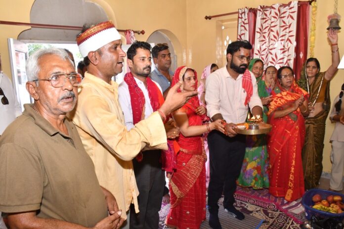 चूरू। सवाई सागर बालाजी धाम स्थित दुर्गा शक्ति मंदिर में नवरात्रा स्थापना दिवस के उपलक्ष में सोमवार को मंदिर में घट स्थापना की गई। हर वर्ष की भांति इस वर्ष भी माता रानी के मंदिर को भव्य फूलों से सजाया गया। पंडित नरोत्तम नागवाण ने वैदिक मंत्रोच्चार के साथ विधिवत पूजा-अर्चना करवाई। मुख्य यजमान नरेन्द्र महर्षि, अजय महर्षि ने सपत्नीक पूजा अर्चना कर माता के 10 दिवसीय नवरात्रि का शुभारंभ किया। सवाई सागर बालाजी धाम के महंत ब्रह्मलीन संत नाथ महाराज की प्रेरणा से माता रानी के मंदिर में घट स्थापना कर माता रानी की आरती कर दिव्य ज्योत प्रज्वलित की गई। पुजारी महेंद्र सारस्वत ने बताया कि आरती में स्थानीय महिला मंडल की उषा सारस्वत, सरोज महर्षि, सत्यभामा महर्षि, कंचन, माया, सरोज देवी, ऊषा शर्मा, नंदा महर्षि, सोनू ओझा, पंडित मुकेश लाटा, जय पंडित, लोकेश अग्रवाल, लालजी भगत, गणेश शर्मा, अनिल, मनोज महर्षि, कुंदन स्वामी सहित अनेक लोग उपस्थित थे। सवाई सागर बालाजी धाम सुरक्षा व्यवस्था समिति के अध्यक्ष सोनू ओझा ने सभी श्रद्धालुओं का दुपट्टा पहनाकर स्वागत किया।