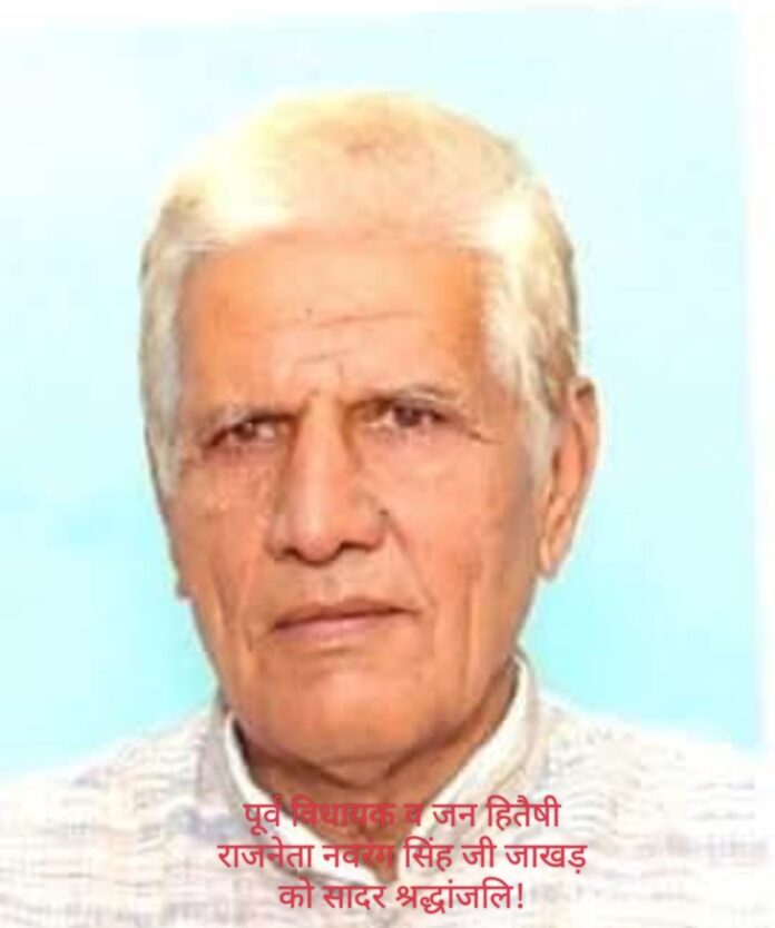 नवलगढ़।किसान छात्रावास नवलगढ़ के संस्थापक सदस्य व नवलगढ़ विधानसभा क्षेत्र से दो बार विधायक रहे किसान नेता नवरंगसिंह जाखड़ का 92 वर्ष की आयु में शुक्रवार रात्रि को निधन हो गया था। उनका अंतिम संस्कार पैतृक गांव धमोरा में शनिवार को किया गया। बलदेव सिंह थोरी ने बताया कि किसान छात्रावास नवलगढ़ में मंगलवार सुबह 10 बजे नवरंग सिंह जाखड़ की श्रद्धांजलि सभा शुरू होगी। जिसमें बड़ी संख्या में क्षेत्र के लोग जुटेंगे।