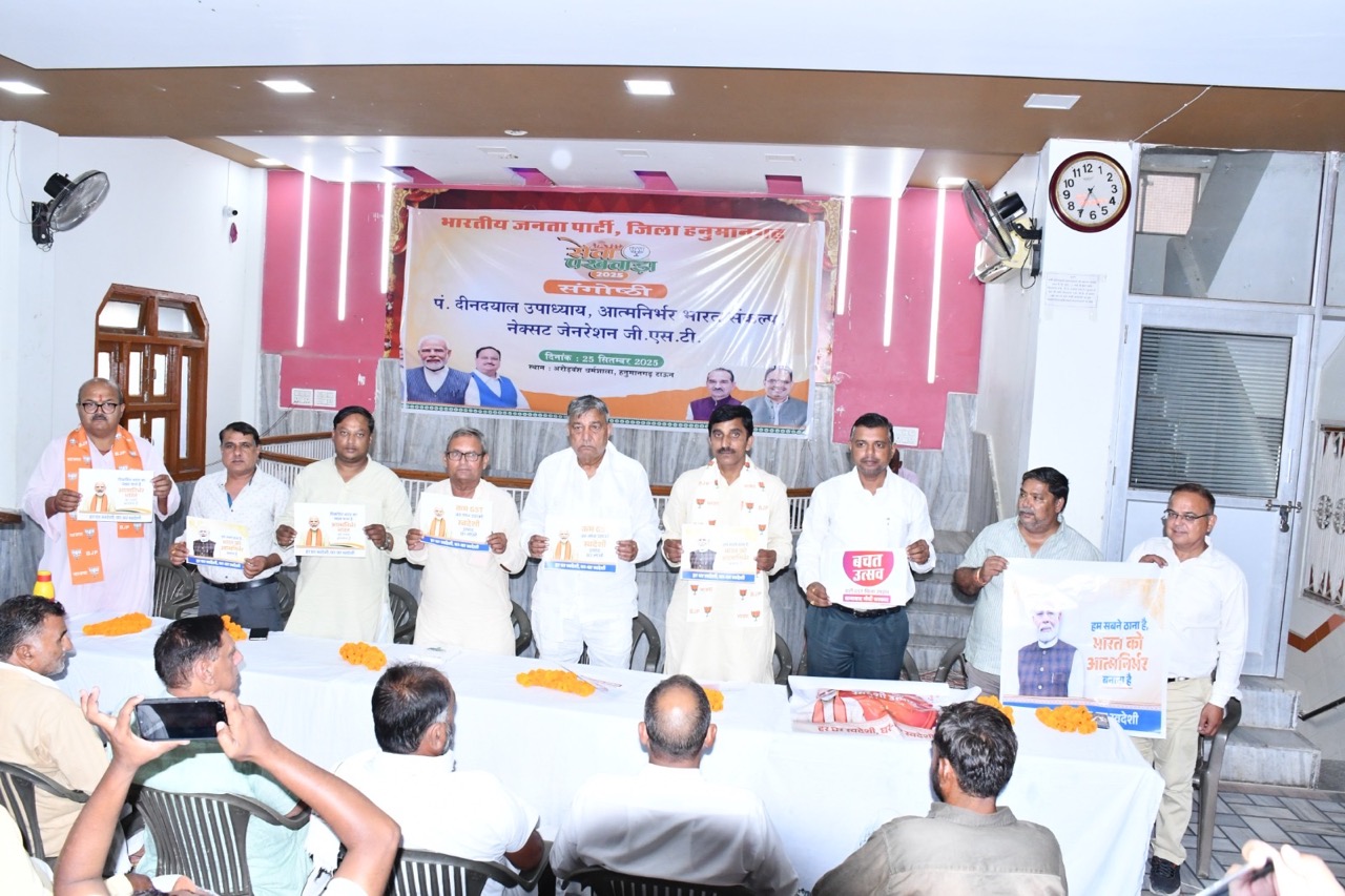 भारतीय जनता पार्टी हनुमानगढ़ द्वारा सेवा पखवाड़े के अंतर्गत शुक्रवार को श्री अरोड़वंश धर्मशाला, हनुमानगढ़ टाउन में एक विचार संगोष्ठी का आयोजन किया गया। संगोष्ठी का विषय “पंडित दीनदयाल उपाध्याय, आत्मनिर्भर भारत संकल्प और जीएसटी नेक्स्ट जेनरेशन” रखा गया। कार्यक्रम में बड़ी संख्या में कार्यकर्ता व गणमान्य नागरिक उपस्थित रहे।कार्यक्रम के मुख्य अतिथि राज्य स्तरीय सैनिक कल्याण सलाहकार समिति के अध्यक्ष प्रेम सिंह बाजौर थे। विशिष्ट अतिथि के रूप में जीएसटी नेक्स्ट जेनरेशन के जिला संयोजक मुरलीधर सोनी, आत्मनिर्भर भारत संकल्प के जिला संयोजक भारत भूषण शर्मा, जिला महामंत्रीप्रदीप ऐरी, जिला मीडिया प्रभारी कृष्ण तायल, मंडल अध्यक्ष नितिन बंसल और विपिन गगनेजा मौजूद रहे। कार्यक्रम की अध्यक्षता भाजपा जिलाध्यक्ष प्रमोद डेलू ने की। संगोष्ठी की शुरुआत अतिथियों द्वारा पंडित दीनदयाल उपाध्याय के चित्र पर पुष्प अर्पित कर की गई।मुख्य अतिथि प्रेम सिंह बाजौर ने अपने उद्बोधन में पंडित दीनदयाल उपाध्याय के विचारों और उनके एकात्म मानववाद दर्शन पर प्रकाश डाला। उन्होंने कहा कि उपाध्याय जी का चिंतन आज भी समाज के लिए प्रासंगिक है। आत्मनिर्भर भारत के संकल्प पर चर्चा करते हुए उन्होंने कहा कि देश को स्वदेशी अपनाने और स्थानीय उत्पादों के उपयोग को बढ़ावा देने की आवश्यकता है। उन्होंने जीएसटी नेक्स्ट जेनरेशन को व्यापारियों और आम उपभोक्ताओं दोनों के लिए लाभकारी बताते हुए इसके आगामी स्वरूप और उपयोगिता को रेखांकित किया।आत्मनिर्भर भारत संकल्प के जिला संयोजक भारत भूषण शर्मा ने कहा कि प्रधानमंत्री नरेंद्र मोदी का “वोकल फॉर लोकल” अभियान तभी सफल होगा जब हर नागरिक अपने दैनिक जीवन में भारतीय उत्पादों को प्राथमिकता देगा। उन्होंने कहा कि आत्मनिर्भरता केवल आर्थिक नहीं, बल्कि सामाजिक और सांस्कृतिक दृष्टि से भी आवश्यक है।जीएसटी नेक्स्ट जेनरेशन के जिला संयोजक मुरलीधर सोनी ने अपने संबोधन में कहा कि नई प्रणाली से व्यापार में पारदर्शिता आएगी। टैक्स संग्रहण और प्रशासनिक प्रक्रियाएं सरल होंगी। उन्होंने बताया कि डिजिटल युग में व्यापारियों को नई तकनीकों को अपनाना होगा ताकि वे प्रतिस्पर्धा के साथ कदम से कदम मिलाकर चल सकें।भाजपा जिलाध्यक्ष प्रमोद डेलू ने कहा कि सेवा पखवाड़े के अंतर्गत यह संगोष्ठी केवल एक कार्यक्रम नहीं, बल्कि विचारों का आदान-प्रदान है। पंडित दीनदयाल उपाध्याय के सिद्धांतों को आत्मसात कर ही समाज को नई दिशा दी जा सकती है। उन्होंने कहा कि भाजपा हमेशा जनसेवा के संकल्प के साथ कार्य करती है और सेवा पखवाड़े के दौरान जिला संगठन ने अनेक सामाजिक व जागरूकता कार्यक्रम आयोजित किए हैं। क
