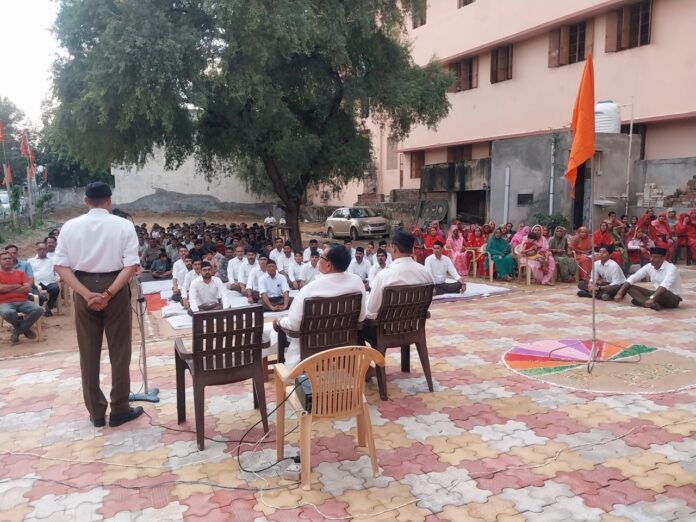 राष्ट्रीय स्वयंसेवक संघ के शताब्दी वर्ष के उपलक्ष में विजयदशमी उत्सव कार्यक्रम झुंझुनूं नगर के समस्त 18 बस्तियों में कार्यक्रम होंगे। जिसमें पीरू सिंह बस्ती का कार्यक्रम में सहनगर कार्यवाह रविंद्र, मुख्य अतिथि रामचंद्र शर्मा और बौद्धिककर्ता मुकेश कुमार, विभाग प्रचारक झुंझुनूं उपस्थित रहे। कार्यक्रम के दौरान कार्यकर्ताओं ने शस्त्र पूजन किया और बड़ी संख्या में मातृशक्ति, स्वयंसेवकों और समाज के प्रमुख जनों ने भाग लिया। उपस्थित प्रमुखों में विभाग व्यवस्था प्रमुख मुरारीलाल, बगड़ खंड कार्यवाह कपिल, नगर प्रचारक रायसिंह, मुख्य शिक्षक रतनलाल, शाखा कार्यवाह हेमंत, नगर व्यवस्था प्रमुख विनोद कुमार, बस्ती प्रमुख जयप्रकाश, कमलकांत शर्मा, सुधीर, नरेंद्र, मनोज, कैलाश, धर्मपाल, रामगोपाल, जयप्रकाश, अनिल, नितिन सहित बड़ी संख्या में स्वयंसेवक मौजूद रहे। बलराम शाखा हनुमान मंदिर न्यू कॉलोनी में कार्यक्रम हुआ। मुख्य वक्ता के रूप में संघ के विभाग प्रचारक मुकेश कुमार मौजूद रहे। बलराम शाखा के मुख्य शिक्षक रतनलाल और कार्यवाह हेमंत ने शाखा टोली के साथ मिलकर व्यवस्थाओं का संचालन किया। नगर व्यवस्था प्रमुख विनोद कुमार ने बताया कि झुंझुनूं नगर की सभी 18 बस्तियों में विजयदशमी उत्सव पांच अक्टूबर तक संपन्न होंगे। विभाग प्रचारक मुकेश कुमार ने विजयदशमी के उत्सव पर संबोधन में पंच परिवर्तन कुटुंब प्रबोधन, सामाजिक समरसता, पर्यावरण संरक्षण, स्व का बोध और नागरिक शिष्टाचार की विस्तृत जानकारी दी। स्वतंत्रता आंदोलन के दौरान डॉ. हेडगेवार द्वारा किए गए स्वतंत्रता आंदोलन में स्वयंसेवक संघ के द्वारा सहयोग के बारे में बताया गया।
