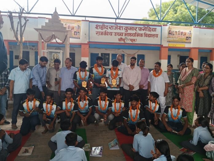 चूरू। शहीद राजेश कुमार फगेड़िया राउमावि घांघू में बुधवार को आयोजित कार्यक्रम में 69 वीं राज्य स्तरीय खेलकूद प्रतियोगिता में अंडर-19 वर्ष क्रिकेट स्पर्धा में भाग लेकर लौटे छात्र खिलाड़ियों का स्वागत किया गया तथा पुरस्कृत किया गया।कार्यक्रम की अध्यक्षता कर रहे प्रभारी संस्था प्रधान सुनिल कुमार ने बताया कि विद्यालय की अंडर-19 वर्ष छात्रों की टीम ने जिला स्तरीय प्रतियोगिता में उत्कृष्ट प्रदर्शन करते हुए क्वार्टर फाइनल तक का सफर किया। साथ ही विद्यालय के दो छात्र शाहिद खान पुत्र अरशद खान एवं मो. अयान पुत्र मो खालिक का चयन राज्य स्तरीय प्रतियोगिता के लिए चूरु जिला टीम में हुआ जो कि विद्यालय परिवार एवं संपूर्ण गांव के लिए गौरव का विषय है।संस्था प्रधान ने टीम को तैयार करने वाले वरिष्ठ शारीरिक शिक्षक सफी मोहम्मद का धन्यवाद दिया तथा विद्यालय स्टॉफ द्वारा वरिष्ठ शारीरिक शिक्षक सफी मोहम्मद का भी माल्यार्पण द्वारा अभिनन्दन किया गया।व.शा.शि सफी मोहम्मद ने खिलाड़ियों की पूरी खेल- यात्रा पर विस्तार से चर्चा की तथा बताया कि चूरू टीम में चयनित दोनो छात्रों का राज्य स्तरीय प्रतियोगिता में उत्कृष्ट प्रदर्शन रहा। उन्होंने बताया कि हमारे विद्यालय के सात (7) खिलाड़ी एथलीट टुर्नामेंट में भाग लेने गये हैं।इस अवसर पर विद्यालय के पूर्व छात्र मो अजीज पुत्र मो. अजीज का भी अभिनन्दन किया गया। कार्यक्रम का संचालन मनोज सेवरा ने किया। इस अवसर पर रामरख शिवरान, शीशराम श्योराण, बाबूलाल गुर्जर, सजाद खान, सुभाष चन्द्र, अरविंद सैनी, नेमीचंद, नवरतन, विद्या महरिया, सीमा मीणा, पूनम मीणा, बिन्नु कावेया, कमलेश, सुमन कस्वा आदि उपस्थित रहे