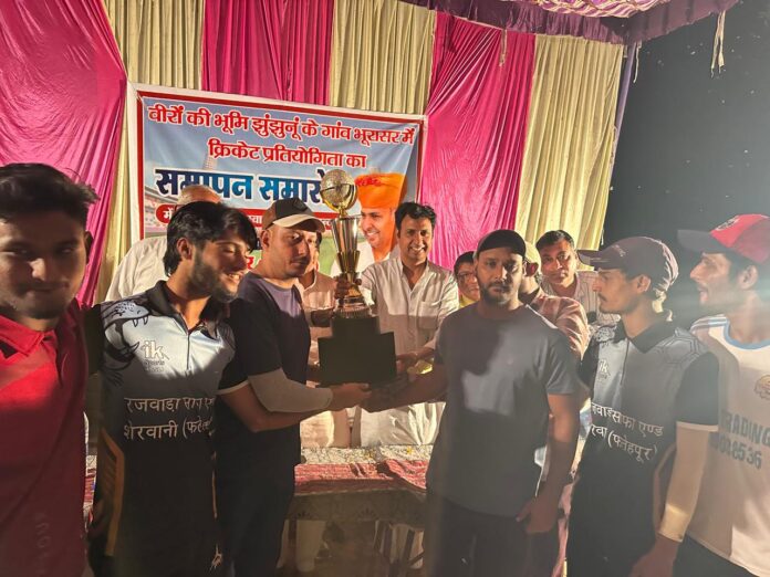 निकटवर्ती भूरासर गांव में शहीदों की याद में महीनेभर से चल रहे भूरासर क्रिकेट कप का समापन रविवार रात को समारोहपूर्वक हुआ। इस प्रतियोगिता में क्षेत्र की 60 के करीब क्रिकेट टीमों ने हिस्सा लिया। जिसमें शेखावाटी टेंट हाउस की टीम विजेता रही। जबकि उजैर इलेवन झुंझुनूं की टीम उप विजेता रही। पुरस्कार वितरण कार्यक्रम के मुख्य अतिथि भाजपा नेता बबलू चौधरी थे। अध्यक्षता शहीद दलीप सिंह थाकन के पिता इंद्राज सिंह थाकन ने की। विशिष्ट अतिथि के रूप में भाजपा जिला प्रवक्ता कमलकांत शर्मा, चनाना सरपंच चरण सिंह व पूर्व सरपंच अजय कड़वासरा थे। अतिथियों ने खिलाड़ियों को नगद राशि व ट्रॉफी प्रदान की। साथ ही खेल को खेल भावना से खेलने की बात कही। इस मौके पर रामकिशन डूडी, बहादुर डूडी, योगेंद्र, आर्यन, मनीष, सुरेश मांजू, कमल मांजू, रविप्रकाश रोहिला, आशीष ढाका, रणजीत सिंह, प्रताप बड़गुर्जर, करण मांजू, कपिल जांगिड़, अमन मांजू, सिद्धार्थ, अशोक कुमार, कर्णसिंह शेखावत आदि मौजूद थे।