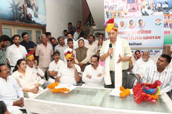 चूरू। कांग्रेस के संगठन सृजन अभियान के तहत AICC द्वारा नियुक्त केंद्रीय पर्यवेक्षक सुभाष चौपड़ा और प्रदेश कांग्रेस की ओर से नियुक्त जिला सह प्रभारी रामनिवास बिड़ोदी व डॉ. राजेंद्र मूंड ने गुरुवार को चूरू के सर्किट हाउस में अंतिम दिन कांग्रेस नेताओं, पदाधिकारियों और कार्यकर्ताओं से संवाद किया।इस दौरान जिलाध्यक्ष पद के लिए इच्छुक नेताओं ने 30 से अधिक आवेदन प्रस्तुत किए और पर्यवेक्षकों के समक्ष अपनी-अपनी दावेदारी और योग्यता रखी। पर्यवेक्षक चौपड़ा ने बताया कि उन्होंने जिले के सभी छह विधानसभा क्षेत्रों में जाकर कार्यकर्ताओं से संवाद किया है।