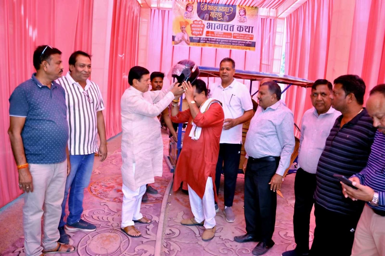 श्रीमद्भागवत कथा के दौरान प्रति दिवस आयोजित सेवा कार्यों की शृंखला में हेलमेट वितरण कार्यक्रम संपन्न