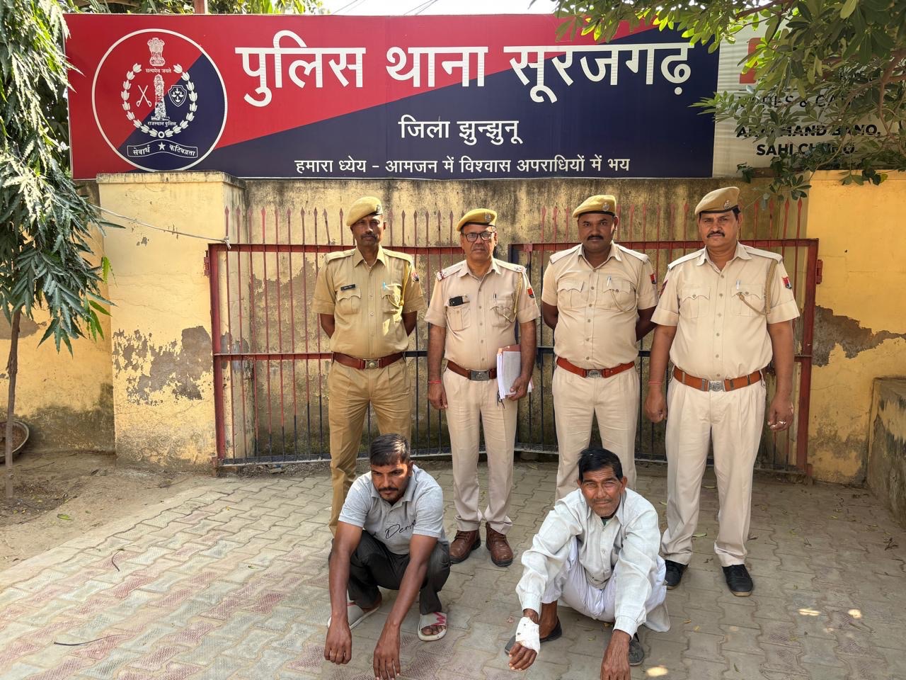मंड्रेला। रविवार को दिन कानून तोड़ने वाले या फिर अपराध करने वाले बाप—बेटों के लिए शुभ नहीं रहा। दरअसल झुंझुनूं पुलिस ने अलग—अलग मामलों में और अलग—अलग जगहों से तीन बाप—बेटों को गिरफ्तार किया। जिससे यह चर्चा शुरू हो गई कि आज संडे का दिन अपराध करने वाले बाप—बेटों के लिए शुभ नहीं रहा। सबसे पहले बात ठग पिता—पुत्रों की। जी, हां झुंझुनूं के मंड्रेला थाने में भारत ईंट उद्योग उद्योग इस्माइलपुर के मालिक अमित द्वारा दर्ज करवाए गए एक ठगी के मामले में मंड्रेला पुलिस ने यूपी से पिता—पुत्र को गिरफ्तार किया है। अमित ने रिपोर्ट दर्ज करवाई थी कि यूपी के पीलीभीत जिले के सूनगढ़ी पीलीभीत थाना क्षेत्र के भिकारीपुर निवासी खलील अहमद तथा उसका बेटा मोहम्मद सलीम उसे ईंट भट्टे पर मजदूर दिलाने के नाम पर अलग—अलग किश्तों में बैंक और नगद 6 लाख 30 हजार रूपए ले गए। उन्होंने 10—15 मजदूर भी उपलब्ध करवाए। लेकिन ठगी के प्लान के अनुसार मजदूर उपलब्ध करवाने के दो दिन बाद ही दोनों आरोपियों ने राष्ट्रीय ओबीसी आयोग में मजदूरों को प्रताड़ित करने की झूठी शिकायत की और दिए गए मजदूर वापिस ले गए। जब अमित ने मजदूर उपलब्ध करवाने के एवज में दिए गए पैसे वापिस मांगे तो दोनों गायब हो गए। मंड्रेला पुलिस ने दोनों बाप—बेटों को यूपी में उनके गांव से ही गिरफ्तार कर कोर्ट में पेश किया। जहां से उन्हें जेल भेज दिया गया। दोनों पिता—पुत्र इतने शातिर निकले कि जो पैसे बैंक अकाउंट में उन्होंने लिए थे। वो भी उन्होंने उड़ाकर अपना बैंक खाते का बैलेंस जीरो कर दिया।