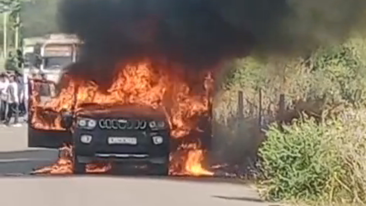 देलसर—कुमावास रोड पर अचानक स्कॉर्पिओ में लगी आग, गाड़ी के दरवाजे हुए लॉक, विंडों से निकले सभी के सभी
