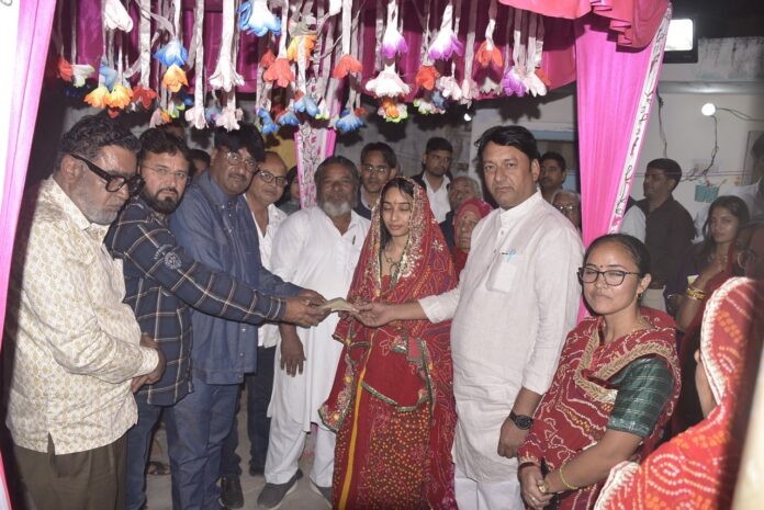 चूरू। जिला मुख्यालय स्थित गढ़ के पास वार्ड नं. 41 निवासी नन्दनी राजोतिया के यहां शादी समारोह में मुस्लिम तेली समाज के भाई रफीक चौहान आईटी सैल, समाजसेवी असलम एमआर, रफीक राजगढ़िया, इस्माईल चौहान, मंगतु भाटी, इस्माईल भाटी, गुलाम हुसैन गौरी, याकुब राजगढ़िया, एडवोकेट सद्दाम हुसैन, हारून मलनस मारको, सलीम चौहान इत्यादि ने बहिन नन्दनी राजोतिया को चुंदड़ी उढ़ाकर एक लाख इक्कीसों रूपये कन्या दान स्वरूप भेंट कर बहिन की शादी में भाईयों का फर्ज निभाया।