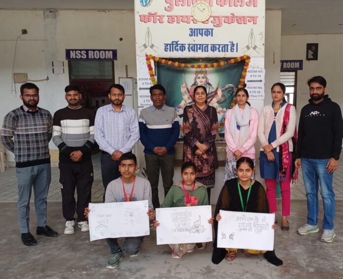 जंक्शन के पुलकित कॉलेज फॉर हायर एजुकेशन, हनुमानगढ़ जंक्शन में सरकार द्वारा संचालित विशेष गहन पुनरीक्षण 2026 अभियान के तहत व्यापक प्रचार-प्रसार हेतु स्वीप गतिविधियों के अंतर्गत विद्यार्थियों में जागरूकता लाने के लिए चित्रकला प्रतियोगिता का सफल आयोजन किया गया। इस प्रतियोगिता में विभिन्न विद्यार्थियों ने उत्साहपूर्वक भाग लिया। प्राचार्या डॉ. चंद्रा गुरनानी ने विद्यार्थियों को एस.आई.आर. के बारे में विस्तार से जानकारी दी तथा बच्चों को सम्बोधित करते हुये कहा कि समाज में जागरूकता फैलाने का दायित्व हम सभी का है। आज की चित्रकला प्रतियोगिता ने सिद्ध किया है कि आप न केवल सृजनशील हैं, बल्कि सामाजिक मुद्दों के प्रति संवेदनशील भी हैं। आपके द्वारा बनाए गए प्रत्येक चित्र ने जागरूकता की एक नई दिशा दिखाई है। आप इसी प्रकार ज्ञान, रचनात्मकता और जिम्मेदारी के साथ आगे बढ़ते रहें यही हमारी सच्ची अपेक्षा है।” प्रतियोगिता ई.एल.सी. प्रभारी श्री पंकज वर्मा के निरीक्षण में सम्पन्न हुई। जिसमें-प्रथम स्थानः तृतीय सेमेस्टर का छात्र जतिन, द्वितीय स्थानः तृतीय सेमेस्टर की छात्रा पूजा व तृतीय स्थानः तृतीय सेमेस्टर की छात्रा यासमीन ने प्राप्त किया। कार्यक्रम में श्री महेंद्र कुमार, कुलदीप सिंह, मुकेश कुमार, निशान्त प्रियंका, अल्का शर्मा आदि सदस्य उपस्थित रहे।