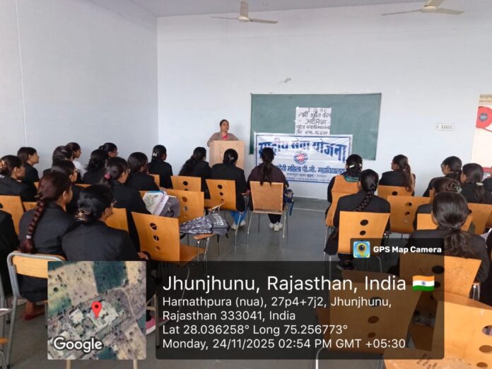 रामादेवी महिला महाविद्यालय नूआं में आईक्यूएसी के तहत एनएसएस के तत्वावधान में नारी शक्ति वंदन अधिनियम- महिला सशक्तिकरण की ओर एक कदम विषय पर एक विचार गोष्ठी का आयोजन किया गया। एनएसएस प्रभारी डॉ. नरेश नैण ने बताया कि इस कार्यक्रम का उद्देश्य महिलाओं को अपने अधिकारों के प्रति जागरूक करना था। एनएसएस प्रभारी डॉ. नीतू सिंह ने नारी शक्ति वंदन अधिनियम के बारे में स्वयंसेविकाओं को जानकारी देते हुए कहा कि इस कानून से महिलाओं की राजनीतिक भागीदारी बढ़ रही है और देश के विकास में महिलाओं की भूमिका बढ़ रही है। नारी शक्ति वंदन अधिनियम महिलाओं के सम्मान और सशक्तिकरण को दर्शाता है। कार्यक्रम में प्राचार्या डॉ. आशा मिश्रा, उप प्राचार्या डॉ. सहला सैय्यद, डॉ. रमाकांत शर्मा, सतीश चौधरी, अशोक शर्मा, डिम्पल मील, सुनिता जाखड़, अनीशा बानो, मनीषा मोदी, सपना स्वामी, विपिन मौजूद थे।
