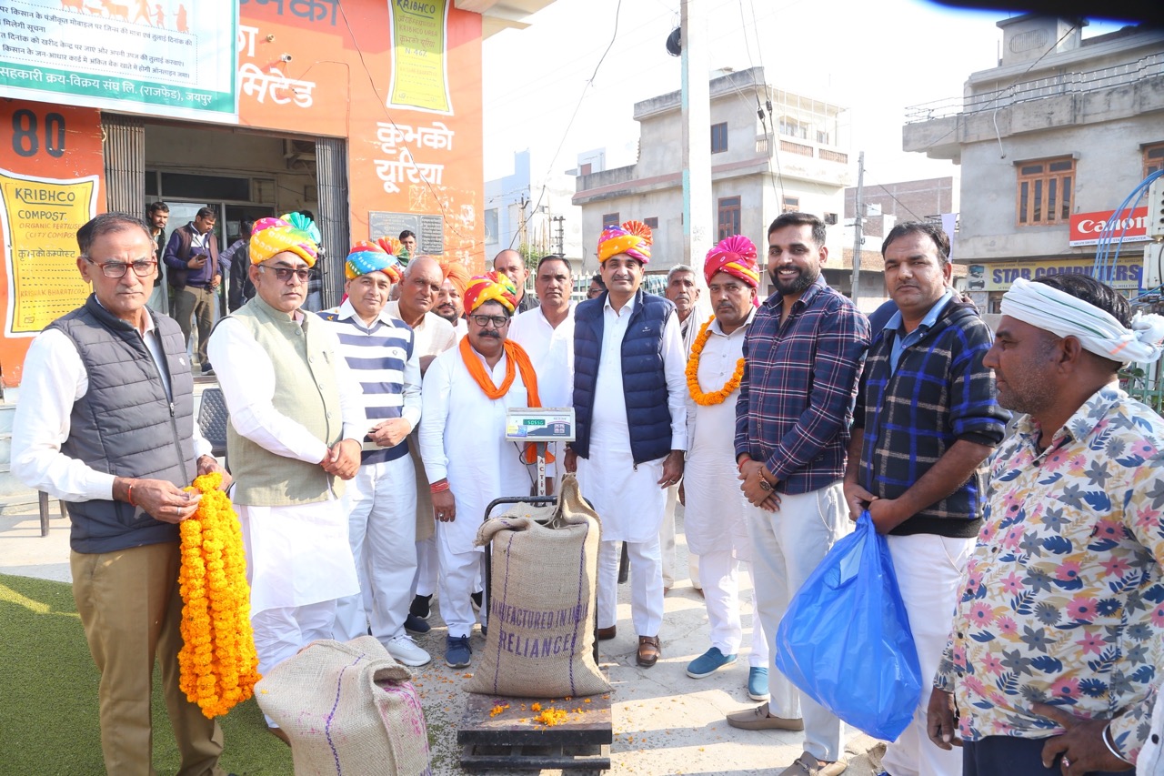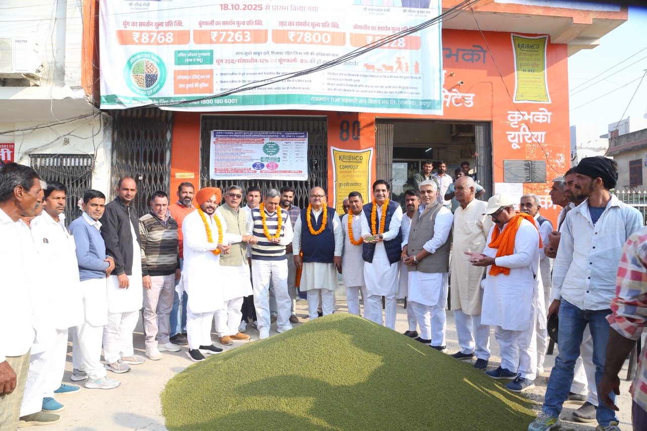 क्रय विक्रय सहकारी समिति लि० की और से न्यूनतम समर्थन मूल्य पर खरीद 2025-26 का शुभारम्भ किया गया एवं समिति के पिड़ पर आने टोकन के अनुसार मूंग लेकर आये किसान श्री सुरेन्द्र कुमार बिजारिया पुत्र श्री लूणाराम किशन पुरा किसान का माला पहनाकर स्वागत किया गया। मूंग का न्यूनतम समर्थन मूल्य 8768/- प्रति क्विंटल है। एवं समिति द्वारा एफ.ए.क्यू. मूंग ही क्रय किया जावेगा। मूंग खरीद अवधि 90 दिनों के लिए समर्थन मूल्य दर पर जारी रहेगी। इस अवसर पर समिति के अध्यक्ष श्री प्रेम कुमार गोदारा, भाजपा नेता अमित सहु, भाजपा महामंत्री प्रदीप ऐरी, भगवान सिंह ख़ुडी, जसपाल सिंह, सरस डेयरी संचालक सदस्य दीपाराम मूड, संचालक मण्डल सदस्य कपिल गोदारा, कृष्ण कुमार ज्याणी, नेतराम शास्त्री, मटोरियावाली ग्राम सेवा सहकारी समिति के अध्यक्ष दीपक सहारण, खरीद प्रभारी सुभाष श्योराण, उपस्थित रहें । किसान सुरेन्द्र बिजाणिया का चैयरमैन प्रेम कुमार गोदारा व संस्था मुख्य व्यवस्थापक अभिषेक गहिया ने साफा पहनाकर स्वागत किया।