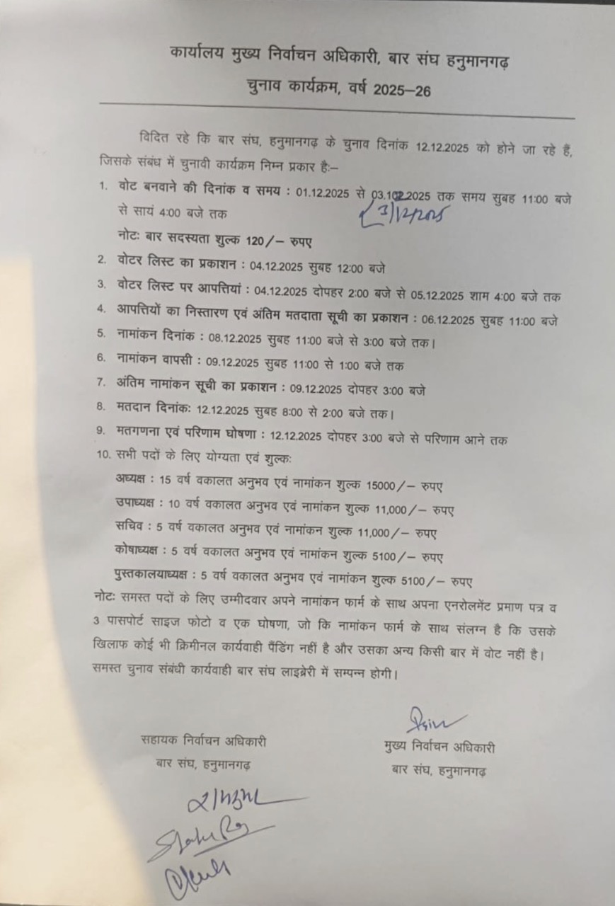 बार संघ हनुमानगढ़ के वर्ष 2025-26 के चुनाव को लेकर तैयारियाँ शुरू हो गई हैं। मुख्य निर्वाचन अधिकारी प्रीतपाल सिंह ने चुनावी कार्यक्रम घोषित करते हुए बताया कि बार संघ के चुनाव आगामी 12 दिसंबर 2025 को संपन्न होंगे। इसके लिए चरणबद्ध कार्यक्रम तय कर दिया गया है, जिसके अनुसार सभी प्रक्रियाएँ निर्धारित तिथियों पर बार संघ लाइब्रेरी में आयोजित की जाएंगी।चुनावी कार्यक्रम के अनुसार 1 दिसंबर 2025 से 3 दिसंबर 2025 तक रोजाना सुबह 11 बजे से शाम 4 बजे तक वोट बनवाने का कार्य किया जाएगा। सदस्यता शुल्क 120 रुपये निर्धारित किया गया है। इसके बाद 4 दिसंबर 2025 को दोपहर 12 बजे वोटर सूची प्रकाशित की जाएगी। उसी दिन 2 बजे से 5 दिसंबर शाम 4 बजे तक वोटर सूची पर आपत्तियाँ स्वीकार की जाएंगी।आपत्तियों के निस्तारण के बाद 6 दिसंबर 2025 को सुबह 11 बजे अंतिम मतदाता सूची जारी होगी। इसके बाद चुनावी नामांकन की प्रक्रिया 8 दिसंबर 2025 को सुबह 11 बजे से दोपहर 3 बजे तक चलेगी। नामांकन वापसी की अंतिम तिथि 9 दिसंबर को सुबह 11 से दोपहर 1 बजे तक निर्धारित है। नामांकन वापसी के बाद 9 दिसंबर दोपहर 3 बजे अंतिम नामांकन सूची प्रकाशित होगी।मुख्य निर्वाचन अधिकारी प्रीतपाल सिंह ने बताया कि मतदान 12 दिसंबर 2025 को सुबह 8 बजे से दोपहर 2 बजे तक होगा, जबकि मतगणना और परिणाम घोषणा उसी दिन दोपहर 3 बजे से प्रारंभ कर दी जाएगी, जो परिणाम आने तक जारी रहेगी।चुनाव में विभिन्न पदों के लिए योग्यता और नामांकन शुल्क भी निर्धारित किए गए हैं। अध्यक्ष पद के लिए 15 वर्ष, उपाध्यक्ष के लिए 10 वर्ष, जबकि सचिव, कोषाध्यक्ष और पुस्तकालयाध्यक्ष पदों के लिए 5 वर्ष का वकालत अनुभव आवश्यक है। अध्यक्ष पद का नामांकन शुल्क 15,000 रुपये, उपाध्यक्ष एवं सचिव का 11,000 रुपये, जबकि कोषाध्यक्ष और पुस्तकालयाध्यक्ष के लिए 5,100 रुपये निर्धारित किए गए हैं।उम्मीदवार को नामांकन फार्म के साथ एनरोलमेंट प्रमाण पत्र, तीन पासपोर्ट साइज फोटो, तथा एक घोषणा पत्र संलग्न करना अनिवार्य होगा, जिसमें यह उल्लेख हो कि उम्मीदवार के खिलाफ कोई क्रिमिनल केस लंबित नहीं है और उसका अन्य किसी बार में वोट नहीं है।चुनावी प्रक्रिया को सुचारु रूप से संचालित करने के लिए मुख्य निर्वाचन अधिकारी प्रीतपाल सिंह के साथ सहायक निर्वाचन अधिकारी रामकुमार सहारण, विमल कीर्ति बिश्नोई, शालू रानी और आशीष भीड़ासरा को जिम्मेदारियाँ सौंपी गई हैं।