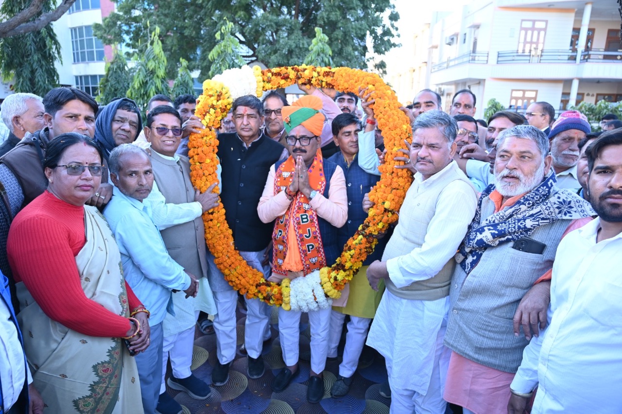 भारतीय जनता पार्टी में फिर से प्रदेश उपाध्यक्ष मुकेश दाधीच की नियुक्ति के बाद प्रथम बार गृह जिले में पधारने पर ढूकिया आवास पर भाजपा जिला उपाध्यक्ष प्यारेलाल ढूकिया के सानिध्य में दयानंद ढूकिया, लालचंद ढूकिया, रणजीत ढूकिया, संदीप ढूकिया, इंजी. पीयूष ढूकिया, मधुर ढूकिया द्वारा 51 किलो का पुष्पहार, साफा व दुपट्टा पहनाकर भव्य स्वागत किया गया। मुकेश दाधीच ने कहा कि मैं प्रदेश में पार्टी हित में सेवा दे रहा हूं, इसी प्रकार प्यारेलाल ढूकिया ने पार्टी में काफी सराहनीय कार्य किए है। मैं सदैव आपके साथ पार्टी हित के लिए हर कार्य के लिए तत्पर रहूंगा। इस अवसर पर भाजपा के राष्ट्रीय परिषद सदस्य विश्वंभर पूनियां, भाजपा जिला महामंत्री एडवोकेट सरजीत चौधरी, भाजपा शहर अध्यक्ष कमलकांत शर्मा, भाजपा जिला मंत्री महेंद्र चंदवा, भाजपा जिला महामंत्री योगेंद्र मिश्रा, भाजपा महिला मोर्चा जिलाध्यक्ष सरोज श्योराण, भाजपा सोशल मीडिया प्रभारी चंद्रप्रकाश शुक्ला, सौरभ सोनी, मंडल अध्यक्ष अमित व्यास, अजय रांगेरा, मुकेश दूत, जगमेंद्र धायल, भगवानाराम पूनियां, हरलालसिंह मोगा, प्रहलाद जाखड़, महावीर मील, सज्जन कोठारी, राजेश कोठारी, मनोज कालेर, नागरमल तेतरवाल, रामचंद्र तेतरवाल, संदीप शर्मा, बाबूलाल सैनी, विनोद पुजारी, चिरंजीलाल चैमाल, विजेंद्र थाकन, रामदेव सिंह बड़सरा, अम्मीलाल मोगा, भागीरथ सिहाग, देवकरण सिंह पायल, अरूण कस्वां, नेमीचंद खीचड़, हनुमान पूनियां, राजेश पूनियां, महेश जीनगर, ओमप्रकाश श्योराण, महेंद्र गढ़वाल, पवन चौमाल, प्यारेलाल थाकन, शौकत अली चैहान, संजय जाखड़, बीरबलराम सिलाईच, नरेंद्रसिंह शेखावत, नरेंद्र मोगा, महेश भालोठिया, बालाराम सिहाग, सुखवीर ढूकिया, पवन शर्मा, महेंद्र कस्वां, रामवतार लोयल, सुनिल जालिमपुरा, लोकेंद्र किलानियां, दलीप सिंह शेखावत, हीरालाल शास्त्री, सलीम खान, महावीर सिंह ईसरवाल, अरूण कौशिक, राजेंद्र पूनियां, रविकुमार लांबा, संजय कुमार बुडानियां, रामवतार सिंह शेखावत, जयसिंह किलानियां, ललित जोशी, मनोज शर्मा आदि उपस्थित थे।
