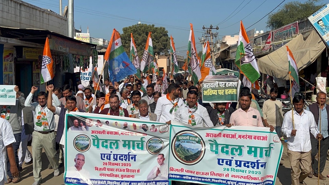 जिले में अरावली पर्वतमाला को लेकर कांग्रेस का गुस्सा थमने का नाम नहीं ले रहा है। इसी कड़ी में झुंझुनूं के सुलताना कस्बे में कांग्रेस कार्यकर्ताओं ने पैदल मार्च निकालकर विरोध प्रदर्शन किया। यह मार्च कांग्रेस नेता अमित ओला के नेतृत्व में निकाला गया। जिसमें गिडानिया ब्लॉक अध्यक्ष सुमेर सिंह तथा सुलताना नगर अध्यक्ष पवन गाडिया समेत बड़ी संख्या में कांग्रेस पदाधिकारी और कार्यकर्ता शामिल हुए। पैदल मार्च चिड़ावा रोड स्थित पॉवर हाउस से शुरू हुआ। जो मुख्य बस स्टैंड, टेकड़ा मोड़ होते हुए चनाना रोड स्थित नगरपालिका कार्यालय भवन के आगे तक पहुंचा। यहां पर कांग्रेस कार्यकर्ताओं ने धरना दिया। पैदल मार्च व धरने के दौरान कांग्रेस नेताओं ने राज्य सरकार के खिलाफ जमकर नारेबाजी की और अरावली क्षेत्र को बचाने की मांग उठाई। इस मौके पर कांग्रेस नेता अमित ओला ने कहा कि सरकार द्वारा कोर्ट में गलत हलफनामा पेश किए जाने के कारण ही यह फैसला आया है। जिसका खामियाजा अब अरावली क्षेत्र को भुगतना पड़ रहा है। अमित ओला ने कहा कि अरावली को बचाने के लिए पुराने कानून और नियम लागू रहना बेहद जरूरी है। उन्होंने आरोप लगाया कि सरकार की लापरवाही और गलत नीतियों के कारण पर्यावरण को गंभीर नुकसान पहुंचने का खतरा पैदा हो गया है। उन्होंने आगे कहा कि यह मामला सिर्फ अरावली पर्वतमाला का नहीं है, बल्कि यह हमारे आने वाले भविष्य, पर्यावरण और जल संरक्षण से जुड़ा हुआ गंभीर मुद्दा है। अगर समय रहते अरावली को नहीं बचाया गया, तो इसके दुष्परिणाम पूरे देश को झेलने पड़ेंगे। कांग्रेस नेताओं ने चेतावनी दी कि अगर सरकार ने इस मुद्दे पर जल्द फैसला नहीं लिया और अरावली संरक्षण के लिए ठोस कदम नहीं उठाए, तो पार्टी आगे भी आंदोलन को तेज करेगी। इस मौके पर पूर्व ब्लॉक अध्यक्ष मोहरसिंह सोलाना, चिड़ावा पंचायत समिति के निवर्तमान उप प्रधान विपिन नूनियां, मंडल अध्यक्ष विजय सिंह लाखलाण, सुरेंद्रसिंह झाझड़िया, जगदीश रैगर, सरपंच उम्मेद सिंह बराला, रामकरण झाझड़िया, रामनिवास गोवला, पूर्व सरपंच गुरूदयाल धींवा, राजेश पूनियां, मौसिम, रवि धनखड़, रमेश ओला, सहीराम धनखड़, विजयपाल पायल, राजकुमार, विनोद लोदीपुरा, कुलदीप ओला, कुलदीप भांबू, प्रदीप पायल, हवासिंह झाझड़िया, महेंद्र डारा, दयाकिशन डारा, इंद्रकुमार लांबा, शकील, फकरूद्दीन लोहा, अनिल कुमार टेलर, अनिल रेप्सवाल पूर्व सरपंच, पंचायत समिति सदस्य भरतसिंह रेप्सवाल, फारूक, यासीन, गुलाब, सलीम, मक्खन, लियाकत कुरैशी भट्ठावाला, सूबेदार रामसिंह, दीपक धींवा, राजू लांबा, राजेश गोदारा, राजकुमार कटेवा, रवि धींधवाल, भरत सिंह, अवतार, संगीत गोठवाल, संदीप बुडानिया आदि मौजूद थे।