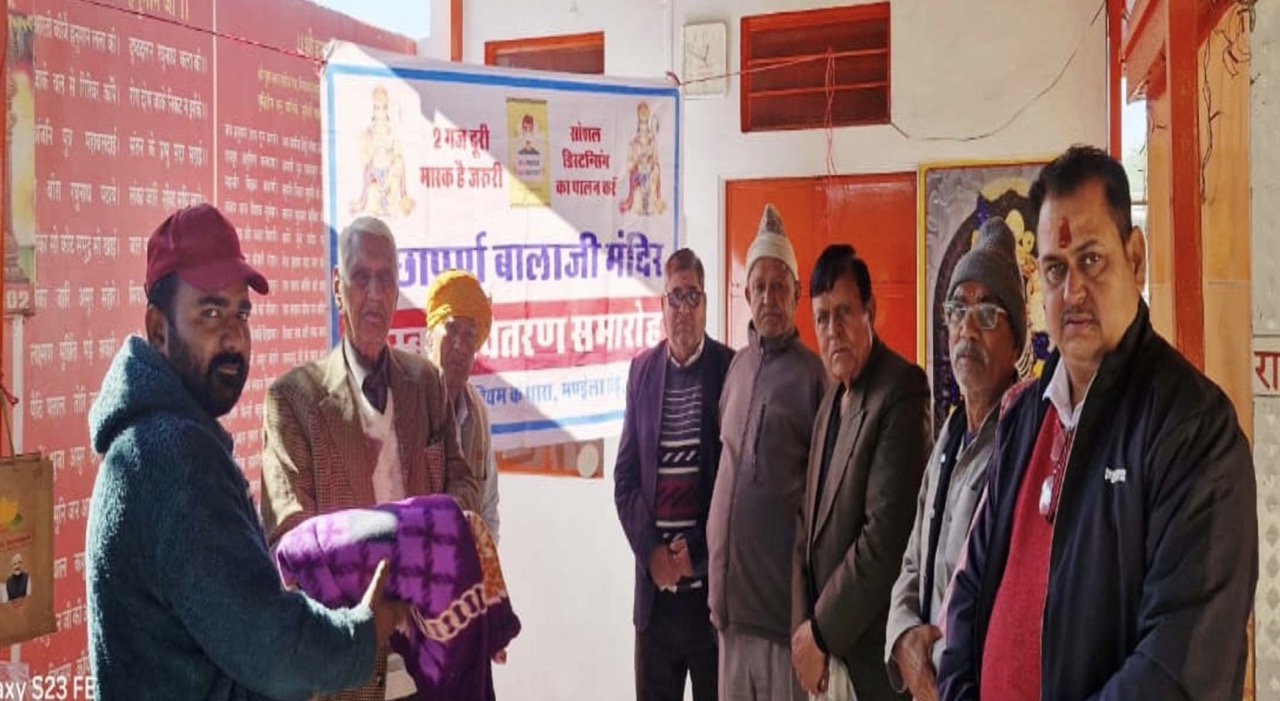 शहर के सेठ मोतीलाल कॉलेज स्टेडियम के पास मंड्रेला रोड स्थित इच्छापूर्ण बालाजी मंदिर परिसर में हर वर्ष की भांति इस वर्ष भी कंबल वितरण कार्यक्रम का आयोजन किया गया। कार्यक्रम में सर्दी से राहत प्रदान करने के उद्देश्य से जरूरतमंदों को कंबल वितरित किए गए।इस अवसर पर समाजसेवा और धार्मिक भावना का सुंदर समन्वय देखने को मिला। कार्यक्रम में गिरदावर शिव शंकर महमियां, वशिष्ठ शर्मा, महावीर सिंगोदिया, राजेंद्र लालपुरिया, राम अवतार शर्मा, रतन लाल शुक्ला, मोहनलाल कुल्हरी, संजय शुक्ला, एडवोकेट रवि प्रकाश शुक्ला, मोहन पुरोहित, रामकरण सैनी, अजय व्यास, सुरेंद्र शर्मा (प्रिंसिपल), सचिन शुक्ला, केशव शुक्ला, सोनू पुजारी, किस्तूर चंद रैगर, संजय शर्मा, शनि मंदिर के पुजारी संजय भार्गव सहित अनेक गणमान्य नागरिक उपस्थित रहे।कार्यक्रम के दौरान वक्ताओं ने कहा कि इस प्रकार के सेवा कार्य समाज में सकारात्मक संदेश देते हैं और जरूरतमंदों को संबल प्रदान करते हैं।कार्यक्रम के समापन पर पार्षद एवं इच्छापूर्ण बालाजी मंदिर व चंद्रेश्वर महादेव मंदिर के पुजारी चंद्र प्रकाश शुक्ला ने सभी अतिथियों, सहयोगकर्ताओं एवं सेवाभावी जनों का आभार व्यक्त करते हुए कहा कि मंदिर परिसर में भविष्य में भी इसी तरह के सेवा कार्य निरंतर जारी रहेंगे।