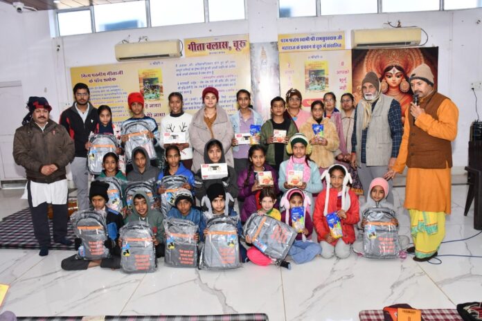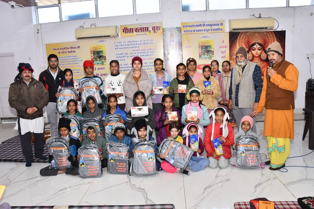 चूरू। सराफ फाउंडेशन द्वारा संचालित भास्कर भवन में चल रही गीता क्लासेज के अंतर्गत रविवार को बच्चों को श्रीमद्भगवद्गीता का अध्ययन करवाया गया। इस अवसर पर वक्ताओं ने कहा कि गीता साक्षात भगवान का हृदय है और जीवन को सही दिशा देने के लिए इसका अध्ययन सभी के लिए आवश्यक है। कार्यक्रम का शुभारंभ सेठ जयदयाल गोयनका, हनुमान प्रसाद पोद्दार एवं स्वामी रामसुखदास महाराज के जयकारों के साथ किया गया। कार्यक्रम में पंचामृत, पांच श्लोक पाठ, स्वामीजी की आवाज में प्रार्थना, गजल गीत, संकीर्तन तथा हनुमान चालीसा पाठ का आयोजन किया गया। इसके साथ ही पोष बड़ा महोत्सव भी श्रद्धा के साथ मनाया गया।इस अवसर पर श्याम भोजक ने सहपत्निक तथा गीता क्लासेज की टीम द्वारा बच्चों को गीता अध्ययन के लिए प्रोत्साहित किया गया। बच्चों को पांच श्लोक पाठ पर स्कूल बैग, 12वें अध्याय के लिए मैगी बॉक्स, 15वें अध्याय के लिए बैडमिंटन, 16वें अध्याय के लिए लंच बॉक्स एवं बच्चों के जन्मदिवस पर ड्रॉइंग किट वितरित की गई।कार्यक्रम में संयोजक संजय सिंघानिया, जनार्दन आचार्य, मोहित सिंघानिया, माधुरी, दिव्या, पूजा, रेनू बजाज, हिमांशु शर्मा सहित अन्य श्रद्धालु उपस्थित रहे।कार्यक्रम संयोजक संजय सिंघानिया ने बताया कि गीता क्लासेज की ओर से फरवरी माह से सभी बच्चों के लिए ऑनलाइन गीता क्लासेज प्रश्नोत्तरी की शुरुआत की जाएगी, जिससे अधिक से अधिक बच्चे गीता के ज्ञान से जुड़ सकें।