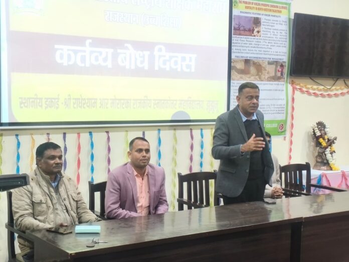 श्री राधेश्याम आर. मोरारका राजकीय महाविद्यालय की अखिल भारतीय राष्ट्रीय शैक्षिक महासंघ (उच्च शिक्षा) इकाई द्वारा शुक्रवार को कर्तव्य बोध दिवस का आयोजन किया गया। जिसकी अध्यक्षता प्राचार्य प्रोफेसर सुरेंद्र सिंह ने की। इस अवसर पर मुख्य वक्ता प्रोफेसर हरिराम आलड़िया रहे। कार्यक्रम का प्रारंभ मां शारदे के समक्ष दीप प्रज्ज्वलन के साथ हुआ। मुख्य वक्ता डॉ. हरिराम आलड़िया ने अपने वक्तव्य में कहा कि कर्तव्य बोध दिवस प्रतिवर्ष 12 जनवरी, स्वामी विवेकानंद जयंती से 23 जनवरी सुभाष जयंती के बीच मनाया जाता है। भारतवर्ष में हर युग में कर्तव्य की प्रधानता रही है, चाहे वैदिक काल हो, महाभारत काल हो या रामायण काल। श्रीकृष्ण ने महाभारत के युद्ध में अर्जुन का रथ चलाकर भी कर्तव्य पालन किया था। हमारे अधिकार तभी तक सुरक्षित हैं। जब तक हम अपने कर्तव्यों का ठीक से पालन करते हैं। इकाई अध्यक्ष महाविद्यालय के प्राचार्य प्रोफेसर सुरेंद्र सिंह ने कहा की वर्तमान में जो हमें पद मिला है, क्या हम उसका पूर्ण निष्ठा से कर्तव्य पालन कर रहे हैं, आज हम सबके लिए आत्मावलोकन करने की आवश्यकता है। यदि हम पूर्ण निष्ठा से अपना कर्तव्य पालन करेंगे तभी समाज के समक्ष आदर्श प्रस्तुत कर सकेंगे। विद्यार्थियों के व्यक्तिगत एवं सम्पूर्ण विकास को ध्यान में रखते हुए हम सभी आचार्यों का यह दायित्व है। हम सभी को सरकारी सेवा नियमों और वित्तीय नियमों की जानकारी होनी चाहिए। हमारे कर्तव्य का हिस्सा है। हम सभी के अंदर ईश्वर विराजमान हैं, जो हमें अपने कर्म का फल अवश्य देता है। डॉ. शुभकरण कुमावत इकाई सह सचिव ने अपने वक्तव्य में कहा कि गीता का श्लोक “कर्मण्येवाधिकारस्ते मा फलेषु कदाचन” का उदाहरण देते हुए कहा कि गीता का उपदेश आध्यात्मिक उपदेश नहीं है, यह कर्तव्य गाथा है। जीवन में पूर्ण निष्ठा व समर्पण से कार्य करने पर सफलता निश्चित रूप से मिलती है। इसलिए निरंतर कार्य करते रहना ही कर्तव्य बोध है। उन्होंने गौतम बुद्ध और सुभाषचंद्र बोस के जीवन के उदाहरणों के द्वारा कर्तव्य पालन का आह्वान किया। देश की आज़ादी के लिए स्वतंत्रता सैनानियों ने अपना सर्वोच्च बलिदान दिया और आज भी हमारे सैनिक देश की सीमाओं की रक्षा करते हुए अपने कर्तव्यों का पालन कर रहे हैं। यदि देश का हर नागरिक अपने कर्तव्य का पालन करे तो आत्मनिर्भर, स्वावलंबी एवं विकसित, विश्वगुरु भारत का सपना साकार हो सकता है। इसलिए हम सभी कर्तव्य पालन द्वारा सामाजिक और सांस्कृतिक परिवर्तन लाकर मानवता के विकास में योगदान दें। डॉ. भंवरलाल ने कहा कि अधिकार और कर्तव्य एक-दूसरे के पूरक हैं। कर्तव्य बोध आंतरिक बल और इच्छा पर निर्भर करता है। शिक्षक और विद्यार्थी दोनों ही अपने कर्तव्य के प्
