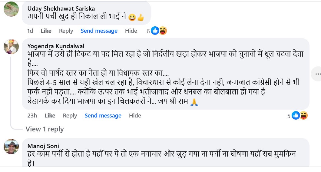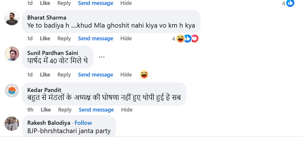 भाजपा शहर मंडल के अध्यक्ष पद पर सीए लोकेश अग्रवाल द्वारा खुद के द्वारा की गई ‘स्वयंभू’ घोषणा के बाद ना केवल खुद सीए लोकेश अग्रवाल, बल्कि बीजेपी भी ट्रोल हो रही है। सोशल मीडिया प्लेटफॉर्म झुंझुनूं अपडेट पर इस खबर का वीडियो प्रसारित होने के बाद उस पर तरह—तरह के कमेंट आ रहे है। भारत शर्मा नाम के एक यूजर ने तो यहां तक लिख दिया कि ये तो बढिया है, खुद को एमएलए घोषित नहीं किया। यही नहीं एक अन्य यूजर उदय शेखावत सरिस्का ने लिखा है कि, अपनी पर्ची खुद ही निकाल ली भाई ने। इसके अलावा हिंदूवादी संगठन के पदाधिकारी योगेंद्र कुंडलवाल ने जमकर भड़ास निकालते हुए कहा है कि ना केवल लोकेश, बल्कि बीजेपी को भी निशाना बनाया है। उन्होंने लिखा है कि भाजपा में उसे ही टिकट या पद मिल रहा है जो निर्दलीय खड़ा होकर भाजपा को चुनावो में धूल चटवा देता है। फिर वो पार्षद स्तर का नेता हो या विधायक स्तर का। पिछले 4-5 साल से यही खेल चल रहा है, विचारधारा से कोई लेना देना नहीं, जन्मजात कांग्रेसी होने से भी फर्क नहीं पड़ता। क्योंकि ऊपर तक भाई भतीजावाद और धनबल का बोलबाला हो गया है। बेड़ा गर्क कर दिया भाजपा का इन्होंने। इसी तरह मनोज सोनी नाम के यूजर ने लिखा है कि हर काम पर्ची से होता है यहां। पर ये तो एक नवाचार और जुड़ गया ना पर्ची, ना घोषणा, यहां सब मुमकिन है। सुनिल प्रधान शर्मा ने लिखा है कि पार्षद में 40 वोट मिले थे। केदार पंडित ने लिखा है कि बहुत से मंडलों के अध्यक्ष की घोषणा नहीं हुए थोपी हुई है सब। जाकिर कायमखानी ने लिखा है कि बेशर्मी है तभी तो भाजपाई है। कुल मिलाकर सोशल मीडिया पर सीए लोकेश अग्रवाल के साथ—साथ भाजपा भी अच्छी किरकिरी हो रही है।