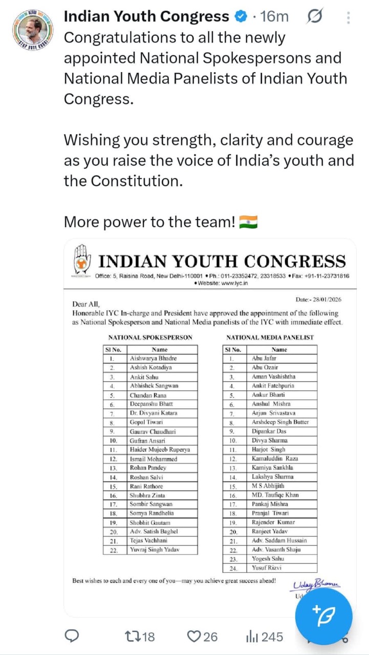 चूरू। कांग्रेस शीर्ष नेतृत्व सोनिया गांधी, राहुल गांधी, मल्लिकार्जुन खड़गे, प्रियंका गांधी, केसी वेणुगोपाल के निर्देशानुसार भारतीय युवा कांग्रेस के राष्ट्रीय प्रभारी मनीष शर्मा एवं राष्ट्रीय अध्यक्ष उदयभान चिब की ओर से राष्ट्रीय कार्यालय नई दिल्ली से जारी नियुक्ति में चूरू के एडवोकेट सद्दाम हुसैन को भारतीय युवा कांग्रेस का राष्ट्रीय प्रवक्ता बनाया गया है।एडवोकेट सद्दाम हुसैन की नियुक्ति पर छाञ एवं युवा शक्ति व कांग्रेस जनों ने हर्ष व्यक्त किया तथा कांग्रेस के शीर्ष नेतृत्व का हार्दिक आभार व्यक्त किया।एडवोकेट सद्दाम हुसैन इससे पहले भी कांग्रेस की छात्र इकाई एनएसयूआई एवं भारतीय युवा कांग्रेस में राष्ट्रीय प्रवक्ता एवं राष्ट्रीय संयोजक तथा महाराष्ट्र, गुजरात, मध्यप्रदेश, पूर्व उत्तर प्रदेश इत्यादि राज्यों के प्रभारी के रूप में भी संगठन में उत्कृष्ट एवं उल्लेखनीय कार्य कर चुके हैं।एडवोकेट सद्दाम हुसैन अभी तक यूजी एवं पीजी सहित कुल दस उपाधियां अर्जित कर चुके हैं।एडवोकेट सद्दाम हुसैन जिला राज्य एवं राष्ट्रीय स्तर पर दर्जनों बार सम्मानित हो चुके हैं।