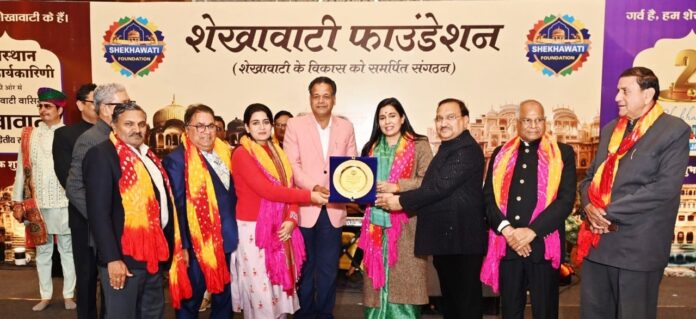 समारोह में सुप्रसिद्ध गायिका कलाकार सीमा मिश्रा सहित अन्य क्षेत्र की हस्तियों का भी सम्मान किया गया। इस अवसर पर बतौर अतिथि वासुदेव देवनानी विधानसभा अध्यक्ष, झाबर सिंह खर्रा स्वायत्त शासन मंत्री, सैनिक कल्याण बोर्ड चेयरमैन प्रेमसिंह बाजौर, भाजपा के पूर्व प्रदेश अध्यक्ष डॉ. सतीश पूनियां, कालीचरण सर्राफ विधायक, हरलाल सहारण विधायक, राजेंद्र पारीक विधायक, गोरधन वर्मा विधायक, मंजू शर्मा पूर्व विप्र आयोग उपाध्यक्ष, राजपाल शर्मा पूर्व छात्रसंघ अध्यक्ष, सौम्या गुर्जर महापौर जयपुर सहित अन्य राजनीतिक एवं सामाजिक हस्तियां उपस्थित थी जिन्होंने दीप प्रज्ज्वलन के साथ कार्यक्रम का शुभारंभ किया एवं अतिथियों का शेखावाटी फाउंडेशन की ओर से स्वागत अभिनंदन किया गया। इस अवसर पर राष्ट्रीय अध्यक्ष विनोद गोयल, उपाध्यक्ष जाकिर भाटी, गिरधारीलाल शर्मा, मुख्य संयोजक पशुपति शर्मा, महासचिव गजानंद शर्मा संयोजक हरिशंकर शर्मा, प्रदेश अध्यक्ष सुशील गुप्ता, प्रदेश महामंत्री राकेश कुमार लाटा, प्रदेश कोषाध्यक्ष महावीर अग्रवाल सहित संस्था के पदाधिकारी एवं सदस्य बड़ी संख्या में उपस्थित थे। शेखावाटी फाउंडेशन का यह गरिमामय आयोजन सेवा, संगठन और सकारात्मक परिवर्तन की प्रेरणा से परिपूर्ण रहा। क्षेत्र के विकास, शिक्षा, स्वास्थ्य, पर्यावरण संरक्षण, युवा नेतृत्व, महिला सशक्तिकरण एवं सामाजिक उत्थान जैसे क्षेत्रों में फाउंडेशन की स्पष्ट दृष्टि और ठोस कार्ययोजना शेखावाटी के उज्ज्वल भविष्य का भरोसा देती है। पूर्ण विश्वास है कि शेखावाटी फाउंडेशन जन भागीदारी और समर्पण के साथ शेखावाटी के विकास को नई दिशा और नई गति प्रदान करेगा।