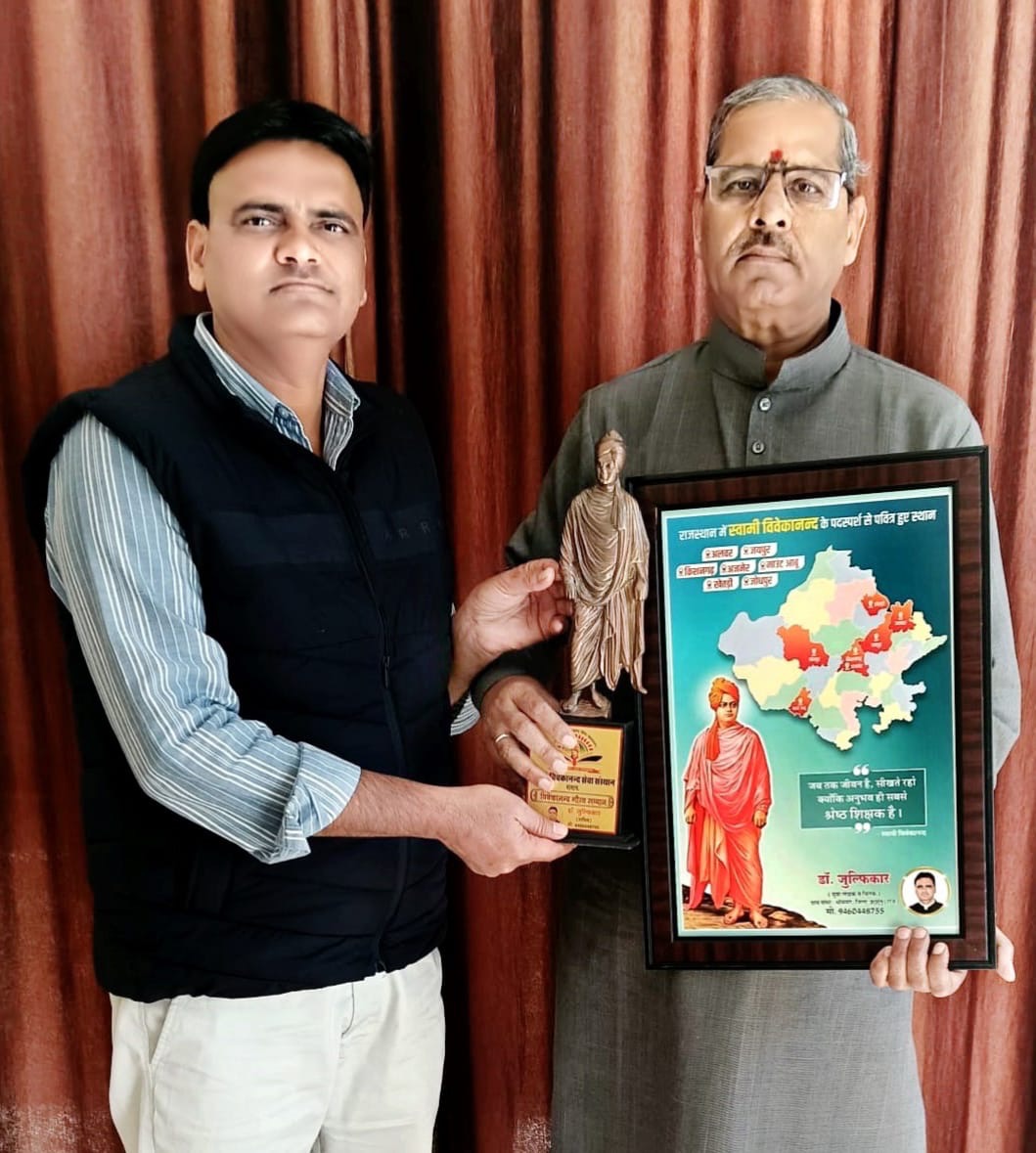 देश-विदेश में शोधकार्य कर स्वामी विवेकानंद पर पीएचडी करने और उनके विचारों का प्रचार-प्रसार करने का बीड़ा उठाने वाले जिले के भीमसर गांव के युवा लेखक व चिंतक डॉ. जुल्फिकार ने जयपुर के भारती भवन में घुमंतू जाति उत्थान न्यास के अखिल भारतीय कार्य अधिकारी दुर्गादास को अपनी दो पुस्तकें रामकृष्ण मठ एवं रामकृष्ण मिशन व स्वामी विवेकानंद चिन्तन एवं रामकृष्ण मिशन खेतड़ी भेंट की। साथ ही रामकृष्ण मिशन खेतड़ी सहित स्वामी विवेकानंद के पद-स्पर्श से पवित्र हुए स्थान अलवर, जयपुर, किशनगढ़, अजमेर, माउंट आबू, खेतड़ी-झुंझुनूं व जोधपुर आदि उन स्थानों का मानचित्र भी भेंट किया। जहां राजस्थान में 316 दिन की प्रवास यात्राओं के दौरान स्वामीजी गए थे। इस अवसर पर आरएसएस के अखिल भारतीय कार्य अधिकारी दुर्गादास ने कहा कि अपने देश और धर्म पर प्राण न्यौछावर करने वाले सत्यव्रती राजस्थानी वीरों तथा वीरांगनाओं के प्रति स्वामीजी को विशेष गौरव तथा प्रेम था। इस मौके पर भारती भवन में आरएसएस के सभी वरिष्ठ प्रचारकों को स्वामी विवेकानंद कैलेंडर और विवेकानंद प्रतिक चिह्न भी भेंट किए गए। डॉ. जुल्फिकार ने आरएसएस के वरिष्ठ प्रचारकों को बताया कि राष्ट्रीय युवा दिवस 2020 से शुरू हुआ था। विवेकानंद कैलेंडर अभियान अब तक सात वर्षों में 71 हजार 112 विवेकानंद कैलेंडर निशुल्क वितरित किए जा चुके हैं और आगे भी एक लाख युवाओं तक स्वामीजी के संदेश वाले कैलेंडर पहुंचाने का लक्ष्य रखा गया है।