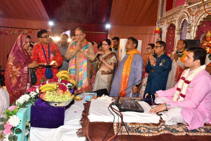 भारी वर्षा देख भगवान श्री कृष्ण गोवर्धन पर्वत को अपनी कनिष्का अंगुली पर उठाकर पूरे बृजवासियों को उसके नीचे बुला लेते हैं और इंद्र के प्रकोप से बचा लेते हैं। जिससे भगवान इंद्र हार कर एक सप्ताह बाद वर्षा बंद कर देते हैं। जिस कारण बृजवासी भगवान कृष्ण एवं गोवर्धन महाराज की जय जयकार लगाते हैं। उन्होंने कहा भगवान को कठिन मार्ग से नहीं सच्चे प्रेम से, प्रभु को पाया जा सकता है। कथा के दौरान गोवर्धन भगवान की झांकी सजाई गई। संयोजक प्रदीप शर्मा ने बताया बिमल शर्मा एवं पुष्पा शर्मा को वैदिक मंत्रोचार के साथ गोवर्धन महाराज का विधिवत पूजन करवाया तथा गोवर्धन भगवान के 56 प्रकार के व्यंजनो का भोग लगाया। इस अवसर सुनिल शर्मा, आदित्य शर्मा, ताराचंद गुप्ता, जुगल मोदी, भोपालसिंह, संजय शर्मा, कैलाश सिंघानिया, शिवचरण हलवाई, कैलाश जांगिड़, किशोरीलाल टीबड़ा, उमाशंकर महमिया, ओमप्रकाश शर्मा, रमेश चौमाल, सुशील टीबड़ा, पुरुषोत्तम चौरासिया आदि भक्तगण मौजूद थे।
