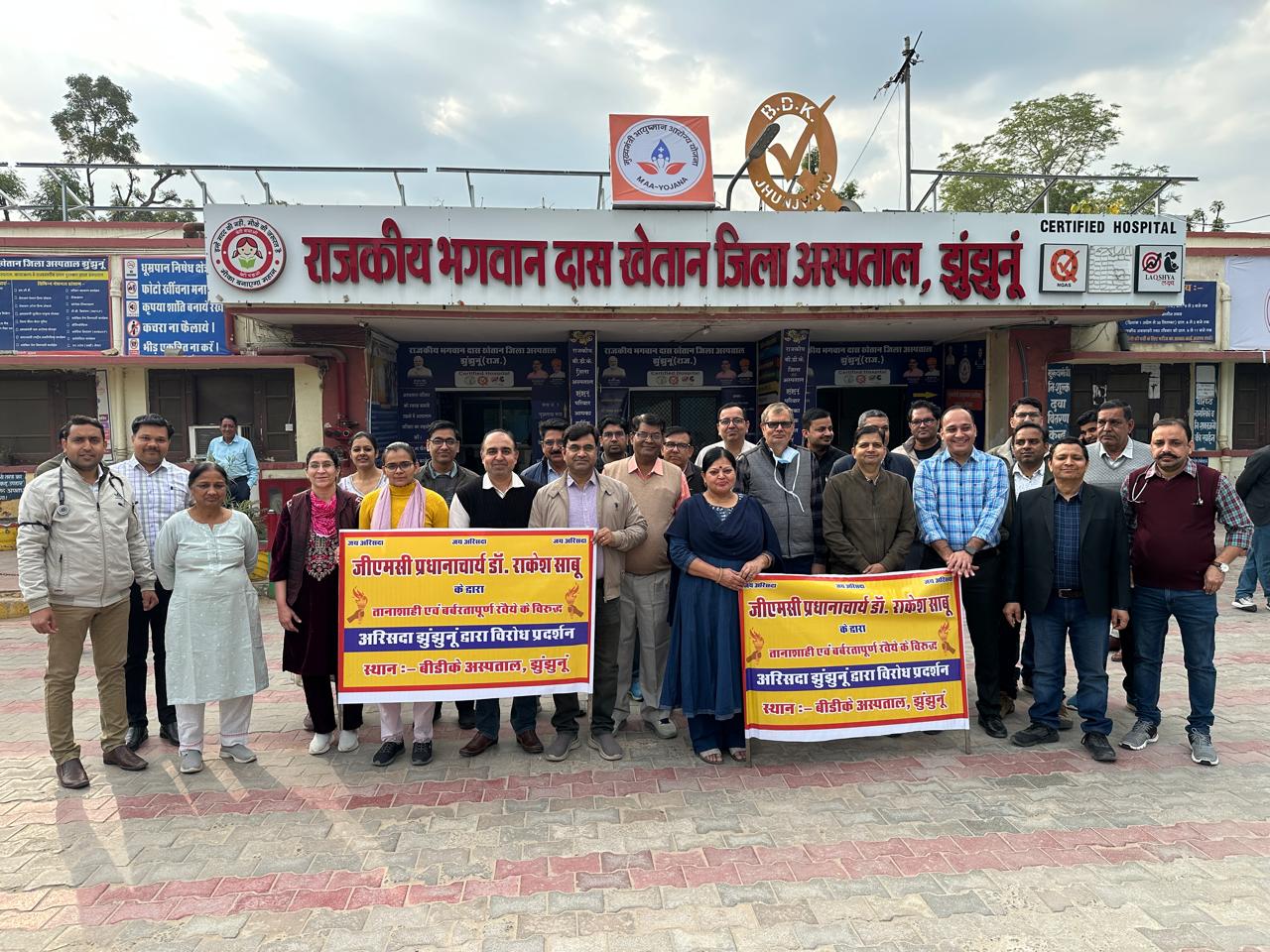 मेडिकल कॉलेज प्राचार्य डॉ. राकेश साबू के कथित तानाशाही एवं बर्बरतापूर्ण रवैये से आहत सेवारत चिकित्सक संघ ने एकजुटता दिखाते हुए मंगलवार को तीसरे दिन जिलेभर के 400 चिकित्सकों ने काली पट्टी बांधकर विरोध जताया। जिले के सबसे बड़े राजकीय अस्पताल झुंझुनूं के 75 चिकित्सकों ने काली पट्टी बांधकर छह माह में छह चिकित्सकों को बर्खास्त करने के विरोध में अस्पताल के मुख्य द्वार पर प्रदर्शन किया। डॉ. साबू के बर्बरतापूर्ण एवं तानाशाही रवैये की निंदा की गई। अरिसदा चिकित्सकों ने मुख्यद्वार पर अरिसदा अध्यक्ष डॉ. एसए जब्बार के नेतृत्व एवं डॉ. राजेन्द्र ढाका महासचिव की अध्यक्षता में जीबीएम का आयोजन किया गया। जीबीएम में पीएचसी, सीएचसी,उप जिला अस्पताल एवं जिला अस्पताल समेत 175 संस्थानों में कार्यरत लगभग 400 चिकित्सकों के द्वारा काली पट्टी बांधकर विरोध प्रदर्शन कार्यवाही होने तक जारी रखने का निर्णय लिया गया है। साथ ही शुक्रवार 20 फरवरी से दो घंटे का कार्य बहिष्कार करने का निर्णय लिया गया है। जिसमें आपातकालीन सेवाएं जारी रहेगीं। इस मौके पर राज्यव्यापी आंदोलन की रूपरेखा पर भी चर्चा की गई।अरिसदा प्रवक्ता डॉ. विजय झाझड़िया ने बताया कि लोकतंत्रिक देश में तानाशाही एवं बर्बरतापूर्ण तरीके से मेडिकल कॉलेज में बिना किसी अतिरिक्त मानदेय के शिक्षण कार्य कर रहे चिकित्सकों को बर्खास्त करना निंदनीय कृत्य है। चिकित्सकों की कमी से जूझ रही मेडिकल कॉलेज में प्राचार्य की तानाशाही प्रवृति से चिकित्सा वर्ग आहत एवं अपमानित महसूस कर रहा है। आगामी दिनों में प्रदेशव्यापी आंदोलन की रूपरेखा तैयार की जा रही है। विरोध प्रदर्शन में इस दौरान अरिसदा महासचिव डॉ. राजेंद्र ढाका, डॉ श्रीराम दूलड़, डॉ. अनिता गुप्ता, डॉ. शीशराम गोठवाल, डॉ. पुष्पा रावत, डॉ. राजेंद्र पायल, डॉ. जगदेव सिंह, डॉ. मधु तंवर, डॉ. आकांक्षा, डॉ. मनीषा चौधरी, डॉ. श्वेता, डॉ. दीपक देवठिया, डॉ. सपना झाझड़िया, डॉ. राहुल सोनी, डॉ. गौरव बूरी, डॉ. इकराज अहमद, डॉ. दुष्यंत बसेरा, डॉ. प्रियंका कस्वां, डॉ. सुरेश मील, डॉ. नेमीचंद, डॉ. संदीप नेमीवाल, डॉ. प्रमोद तेतरवाल, डॉ. प्यारेलाल भालोठिया, डॉ. विजेंद्र ज्याणी, डॉ. अरविंद जाखड़, डॉ. नवीन, डॉ. कपूर थालौर, डॉ. पूनम चौधरी समेत चिकित्सकों ने विरोध प्रदर्शन किया।