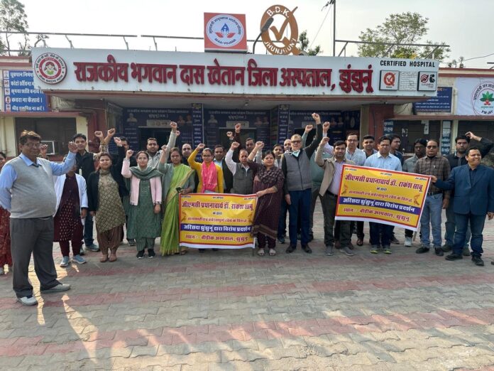 अखिल राजस्थान सेवारत चिकित्सक संघ (अरिसदा) झुंझुनूं के आह्वान पर जिलेभर में सेवारत चिकित्सकों का विरोध प्रदर्शन लगातार चौथे दिन भी जारी रहा। चिकित्सक काली पट्टी बांधकर मरीजों का उपचार कर रहे। ताकि रोगियों को किसी प्रकार की असुविधा न हो। मामला गवरमेंट मेडिकल कॉलेज प्राचार्य डॉ. राकेश साबू के कथित तानाशाही एवं बर्बरतापूर्ण रवैये से जुड़ा है। संघ के अनुसार पिछले छह माह में छह चिकित्सकों की बर्खास्तगी से चिकित्सा वर्ग आहत है। जिले के 175 संस्थानों के लगभग 400 चिकित्सक इस निर्णय के विरोध में प्रदर्शन कर रहे हैं। अरिसदा प्रवक्ता डॉ. विजय झाझड़िया ने बताया कि दौसा और हनुमानगढ़ जिलों ने भी आंदोलन को समर्थन दिया है। प्रदेशाध्यक्ष डॉ. अजय चौधरी को पूरे घटनाक्रम से अवगत कराया गया है। मुख्यमंत्री, चिकित्सा मंत्री एवं राष्ट्रीय चिकित्सा आयोग को ज्ञापन भेजा जा चुका है। अरिसदा अध्यक्ष डॉ. एसए जब्बार ने कहा कि चिकित्सक मरीजों की सेवाओं को प्रभावित किए बिना शांतिपूर्ण ढंग से विरोध जता रहे हैं। लेकिन उचित कार्रवाई नहीं होने पर कार्य बहिष्कार जैसे कदम पर भी विचार किया जा सकता है। अरिसदा महासचिव डॉ. राजेन्द्र ढाका ने बताया कि सेवारत पदनामित चिकित्सक बिना मानदेय के मेडिकल कॉलेज में शिक्षण सेवाएं दे रहे थे। माइक्रोबायोलॉजी और फार्माकोलॉजी विभागों में फैकल्टी की कमी के बावजूद उनकी सेवाओं से ही राष्ट्रीय चिकित्सा आयोग से मान्यता प्राप्त हुई थी। ऐसे में बिना अनुमति बर्खास्तगी को संघ ने निंदनीय बताया है। विरोध प्रदर्शन में अरिसदा महासचिव डॉ. राजेंद्र ढाका, डॉ. श्रीराम दूलड़, डॉ. अनिता गुप्ता, डॉ. शीशराम गोठवाल, डॉ. पुष्पा रावत, डॉ. राजेंद्र पायल, डॉ. जगदेव सिंह, डॉ. सुमन भालोठिया, डॉ. कृष्णा, डॉ. बंशीधर झाझड़िया, डॉ. मधु तंवर, डॉ. आकांक्षा, डॉ. मनीषा चौधरी, डॉ. श्वेता, डॉ. दीपक देवठिया, डॉ. सपना झाझड़िया, डॉ. राहुल सोनी, डॉ. गौरव बूरी, डॉ. इकराज अहमद, डॉ. दुष्यंत बसेरा, डॉ. प्रियंका कस्वां, डॉ. सुरेश मील, डॉ. नेमीचंद, डॉ. संदीप नेमीवाल, डॉ. प्रमोद तेतरवाल, डॉ. प्यारेलाल भालोठिया, डॉ. विजेंद्र ज्याणी, डॉ. अरविंद जाखड़, डॉ. नवीन, डॉ. कपूर थालौर, डॉ. पूनम चौधरी सहित अनेक चिकित्सक शामिल रहे।