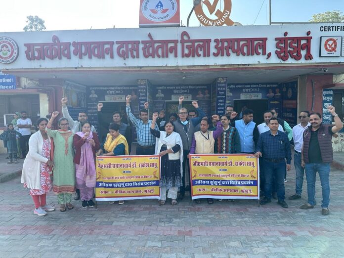 जिले के सेवारत चिकित्सक संघ ने एकजुटता दिखाते हुए जिलेभर के 400 चिकित्सकों ने काली पट्टी बांधकर विरोध जताया। जिले के सबसे बड़े राजकीय अस्पताल झुंझुनूं के 75 चिकित्सकों ने काली पट्टी बांधकर छह माह में छह चिकित्सकों को बर्खास्त करने के विरोध में अस्पताल के मुख्य द्वार पर प्रदर्शन किया। डॉ. साबू के कथित बर्बरतापूर्ण एवं तानाशाही रवैये की भर्त्सना की गई। अरिसदा चिकित्सकों ने मुख्यद्वार पर अरिसदा अध्यक्ष डॉ. एसए जब्बार के नेतृत्व एवं डॉ. राजेंद्र ढाका महासचिव की अध्यक्षता में रविवार को जीबीएम का आयोजन किया गया। जीबीएम में पीएचसी, सीएचसी, उप जिला अस्पताल एवं जिला अस्पताल समेत 175 संस्थानों में कार्यरत लगभग 400 चिकित्सकों के विरोध प्रदर्शन तेज करने का निर्णय लिया गया है। बुधवार 25 फरवरी से दो घंटे का कार्य बहिष्कार करने का निर्णय लिया जा चुका है। जिसमें आपातकालीन सेवाएं जारी रहेगीं। अरिसदा प्रवक्ता डॉ. विजय झाझड़िया ने बताया कि मेडिकल कालेज में बिना किसी अतिरिक्त मानदेय के शिक्षण कार्य कर रहे चिकित्सकों को बर्खास्त करना प्राचार्य के अधिकार क्षेत्र से परे एवं दमनात्मक रवैया है। चिकित्सकों की कमी से जूझ रही मेडिकल कॉलेज में प्राचार्य की तानाशाही प्रवृत्ति से चिकित्सा वर्ग आहत एवं अपमानित महसूस कर रहा है। लोकतांत्रिक देश में बर्खास्त किए चिकित्सक अपमानित एवं आहत महसूस कर रहे हैं। बर्खास्त चिकित्सकों ने सोमवार से अन्न त्याग करने का संकल्प लिया है। जो कार्यवाही होने तक जारी रहेगा। विरोध प्रदर्शन में इस दौरान अरिसदा महासचिव डॉ. राजेंद्र ढाका, डॉ. श्रीराम दूलड़, डॉ. अनिता गुप्ता, डॉ. शीशराम गोठवाल, डॉ. पुष्पा रावत, डॉ. राजेन्द्र पायल, डॉ. जगदेव सिंह, डॉ. सिद्धार्थ शर्मा, डॉ. मधु तंवर, डॉ. विनिता मोर, डॉ. आकांक्षा, डॉ. मनीषा चौधरी, डॉ. श्वेता, डॉ. दीपक देवठिया, डॉ. सपना झाझड़िया, डॉ. राहुल सोनी, डॉ. गौरव बूरी, डॉ. इकराज अहमद, डॉ. दुष्यंत बसेरा, डॉ. प्रियंका कस्वां, डॉ. सुरेश मील, डॉ. नेमीचंद, डॉ. संदीप नेमीवाल, डॉ. प्रमोद तेतरवाल, डॉ. प्यारेलाल भालोठिया, डॉ. विजेन्द्र ज्याणी, डॉ. अरविंद जाखड़, डॉ. नवीन, डॉ. कपूर थालौर, डॉ. पूनम चौधरी, डॉ. श्वेता, डॉ. नरेंद्र काजला समेत चिकित्सकों ने विरोध प्रदर्शन किया।