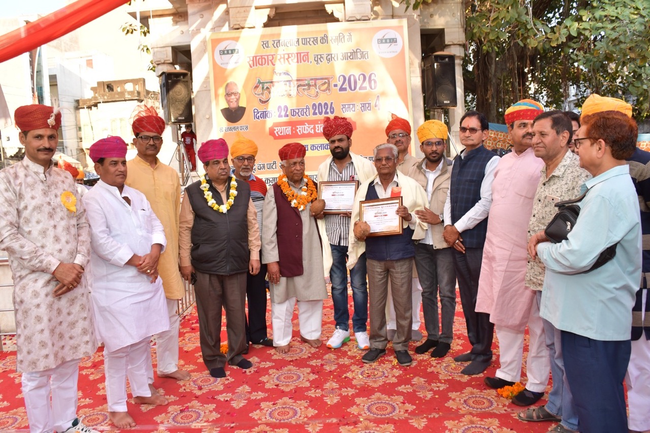 चूरू। रंग, उमंग और लोक परंपराओं की जीवंत छटा के बीच रविवार शाम सफेद घंटाघर पर साकार संस्थान की ओर से आयोजित फागोत्सव–2026 ने शहरवासियों को लोक संस्कृति से सराबोर कर दिया। रतनलाल पारख की स्मृति में बसंत कुमार व संजय कुमार पारख (कोलकाता) के सौजन्य से हुए इस आयोजन ने चूरू की सांस्कृतिक विरासत को फिर से जीवंत कर दिया।राजलदेसर की श्याम म्यूजिकल ग्रुप चंग पार्टी के कलाकारों ने चंग की थाप पर पारंपरिक फाग गीतों की ऐसी रसधार बहाई कि दर्शक खुद को थिरकने से नहीं रोक सके। फाग के रंगों में रचे-बसे गीतों और लोकधुनों ने मरुभूमि की संस्कृति की महक बिखेर दी। कार्यक्रम में बुजुर्गों से लेकर युवाओं तक ने उत्साहपूर्वक भागीदारी निभाई और पूरा माहौल पारंपरिक उत्सव में बदल गया।