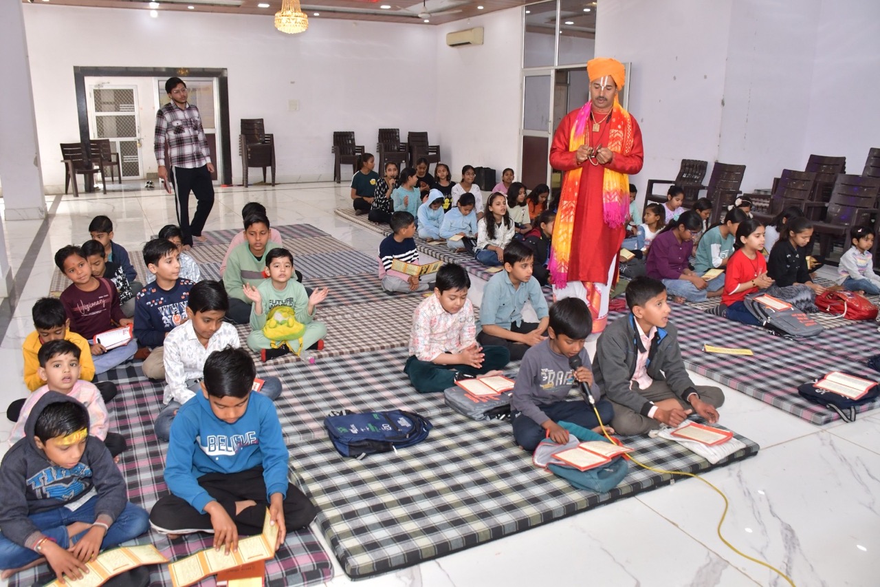चूरू। भास्कर भवन में हर रविवार को नियमित रूप से लगने वाली गीता क्लास में रविवार को गीता पाठ का अभ्यास करवाया गया। कार्यक्रम का शुंभारम्भ दीप प्रज्वल्लित कर किया गया। संजय सिंघानिया ने बताया कि जनार्दन आचार्य के सानिध्य में नियमित रूप से बच्चे गीता पाठ का अध्ययन कर रहे है। रविवार को गीता पाठ के श्लोको का रिविजन करवाया गया। गीता पाठ करने से बच्चों में संस्कार आते है। हर क्लास के बच्चे गीता पाठ का अध्ययन कर रहे है। इस अवसर पर मोहित सिंघानियां, निरंजन आचार्य आदि उपस्थित थे।