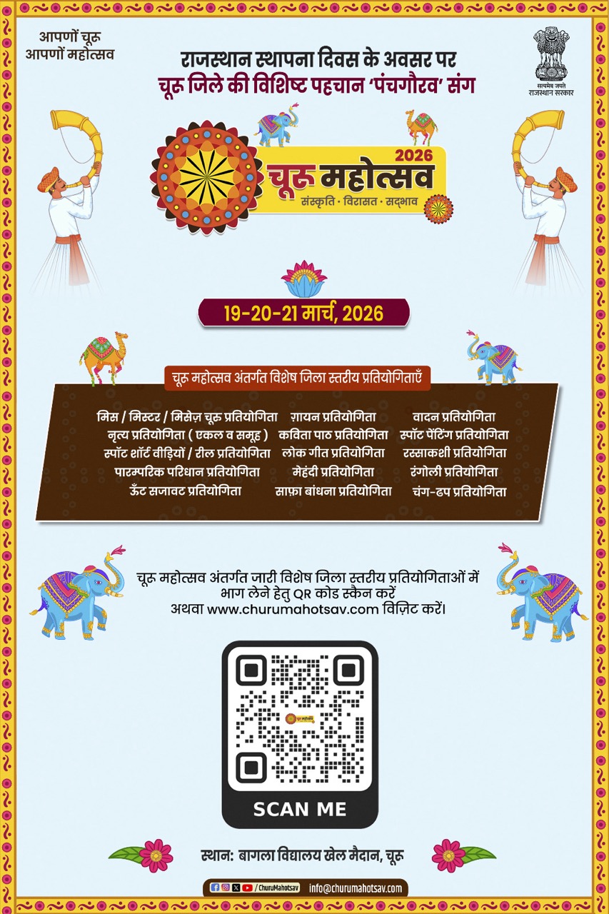 चूरू। जिला प्रशासन स्तर से लिए गए निर्णय के अनुसार राजस्थान स्थापना दिवस के अवसर पर चूरू जिले की विशिष्ट पहचान ‘पंच गौरव संग चूरू महोत्सव —2026’ का अयोजन 19 से 21 मार्च, 2026 तक बागला खेल मैदान चूरू में किया जाएगा।निर्धारित कार्यक्रम के अनुसाी 19 मार्च, 2026 को सवेरे 07.30 बजे गढ़ परिसर से विरासत कार्निवल यात्रा (शोभायात्रा) के साथ चूरू महोत्सव का शुभारंभ होगा।चूरू महोत्सव 02 सत्रों में आयोजित होगा। प्रातः कालीन सत्र में विभिन्न प्रकार की प्रतियोगिताएं जैसे मिस/मिस्टर/ मिसेज चूरू प्रतियोगिता, नृत्य प्रतियोगिता (एकल व समूह), स्पॉट शॉर्ट वीडियो/रील प्रतियोगिता, पारम्परिक परिधान प्रतियोगिता, ऊंट सजावट प्रतियोगिता, गायन प्रतियोगिता, कविता पाठ प्रतियोगिता, लोक गीत प्रतियोगिता, मेहंदी प्रतियोगिता, साफा बांधना प्रतियोगिता, वादन प्रतियोगिता, स्पॉट पेटिंग प्रतियोगिता, रस्सा—कस्सी प्रतियोगिता, रंगोली प्रतियोगिता, चंग-ढप प्रतियोगिता आदि का आयोजन किया जाएगा। इन प्रतियोगिताओं में भागीदारी के लिए आमजन जारी लिंक https://churumahotsav.com/contest-registration.html पर विजिट कर अपना पंजीयन कर सकते है।