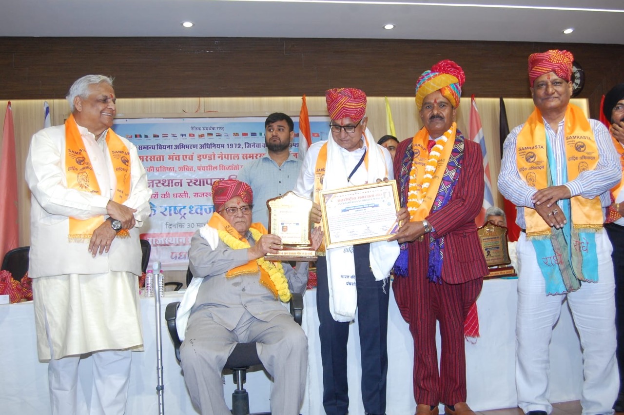 अंतरराष्ट्रीय समरसता मंच एवं राष्ट्रीय समता स्वतंत्र मंच के संयुक्त तत्वावधान में राजस्थान के स्थापना दिवस समारोह में विश्व बंधुत्व एकामहे अवधारणा को साकार करने वाला संगठन अंतर्राष्ट्रीय समरसता मंच (वीसीओ) द्वारा राजस्थान के समृद्ध इतिहास सांस्कृतिक विरासत एवं गौरवशाली परंपराओं को बनाए रखने के उद्देश्य से 30 मार्च को राजस्थान दिवस के पावन अवसर पर समृद्ध सांस्कृतिक सम्मेलन एवं विचार प्रेजेंटेशन कार्यक्रम का भव्य आयोजन गुलाबी नगरी जयपुर में 25 राष्ट्रों के राष्ट्रध्वजों के सानिध्य में संपन्न हुआ। मंच के संयोजक नेपाल सरकार के प्रथम उपराष्ट्रपति के विशिष्ट सलाहकार डॉ. कुलदीप प्रसाद शर्मा ने जानकारी देते हुए बताया कि राजस्थान दिवस महोत्सव के अवसर पर चयनित प्रतिभा पीएचईडी से सेवानिवृत्त इंजीनियर नागरमल जांगिड़ का समारोह मंच के प्रेरणा स्रोत अतिथि सिक्किम के पूर्व राज्यपाल एवं न्यायमूर्ति एसएन भार्गव तथा पूर्व केबिनेट मंत्री डॉ. जितेंद्रसिंह के कर कमलों द्वारा राजस्थान समरसता गौरव अवार्ड से सम्मानित किया गया। जांगिड़ के सम्मानित होने पर अनेक संस्थाओं व मित्रों ने बधाइयां प्रेषित की है।