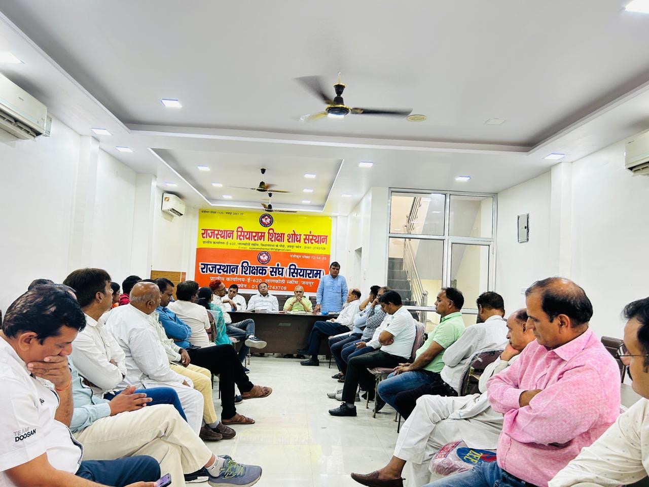 राजस्थान शिक्षक संघ (सियाराम) के संरक्षक मंडल एवं नवनिर्वाचित प्रदेश कार्यकारिणी की बैठक संगठन के लाल कोठी जयपुर स्थित प्रांतीय कार्यालय में प्रदेश अध्यक्ष वीरेन्द्र शर्मा की अध्यक्षता में संपन्न हुई। जिसमें झुंझुनूं से भी शिक्षक नेताओं और संगठन के पदाधिकारियों ने हिस्सा लियज्ञ। प्रदेश महामंत्री रामदयाल मीणा ने बताया कि बैठक में उपस्थित सभी पदाधिकारियों ने शिविरा पंचांग 2026–27 में ग्रीष्मावकाश व संस्था प्रधान द्वारा घोषित अवकाश में कटौती का कड़ा विरोध किया है। राजस्थान की भौगोलिक परिस्थितियों व भीषण गर्मी को देखते हुए जून माह में विद्यालय खोलना पूर्णतया अव्यावहारिक है। क्षेत्रीय व स्थानीय उत्सवों एवं आयोजनों में राजकीय अवकाश नहीं होने पर भी वहां के शत प्रतिशत बालकों की भागीदारी उसमें रहती है। इसी कारण से संस्था प्रधान द्वारा दो अवकाश घोषित किए जाने का प्रावधान रखा गया हैं। इसमें कटौती किया जाना समझ से परे हैं।बैठक में चर्चा हुई कि शिक्षा विभाग द्वारा इस प्रकार के गलत व अव्यावहारिक निर्णय लेने से सरकार की छवि भी धूमिल हुई है। प्रदेश मुख्य महामंत्री उम्मेद सिंह डूडी ने बताया कि विभिन्न प्रकार के अवकाशों में की गई कटौती को तत्काल दूर कर शिविरा कैलेंडर में संशोधन की मांग को लेकर संगठन ने आंदोलन की घोषणा की है। आंदोलन के विभिन्न चरणों में सात अप्रेल को सभी शिक्षक काली पट्टी बांधकर विरोध प्रदर्शन करेंगे। इसी क्रम में आठ अप्रेल को उपशाखा स्तर से उपखंड अधिकारी व 20 अप्रेल को जिला स्तर से जिला कलेक्टर को मुख्यमंत्री के नाम ज्ञापन दिया जाएगा। आंदोलन के इसी क्रम में 18 मई को शिक्षा मंत्री के विधानसभा क्षेत्र रामगंजमंडी में विरोध प्रदर्शन करते हुए विशाल शिक्षक रैली निकाली जाएगी। बैठक को संबोधित करते हुए मुख्य संरक्षक सियाराम शर्मा ने कहा कि शिक्षा मंत्री के सलाहकारों की अदूरदर्शिता एवं विभागीय नासमझी के कारण शिक्षा, शिक्षार्थियों व शिक्षकों से जुड़े महत्त्वपूर्ण मुद्दों पर समय पर निर्णय नहीं लिया जा रहा है। जिससे राज्य में शिक्षा व शिक्षार्थियों का बहुत बड़ा नुकसान हो रहा है। प्रदेश प्रवक्ता मुकेश कुमार मीणा ने बताया कि बैठक में संगठनात्मक मुद्दों व सदस्यता अभियान पर चर्चा कर निर्णय लिए गए। बैठक को संरक्षक राजेन्द्र कुमार शर्मा, लक्ष्मीनारायण स्वामी, रणवीर सिंह गोदारा, ईश्वरदयाल शर्मा, टीकेन्द्र सिंह मीणा, कैलाश चन्द्र जैन, सूबेन्द्र बिजारणियां, राजेन्द्र पारीक, निरंजन शर्मा, पूनम चतुर्वेदी, हेमंत कुमार जांगिड़, बनवारीलाल सैनी, सोहनलाल गुप्ता, बदन सिंह मीणा, रामस्वरूप वर्मा, अमित कुमार योगी, हनुमान प्रसाद बैरवा, मान सिंह श्योराण, मंजू डोरिया, विनोद कुमा