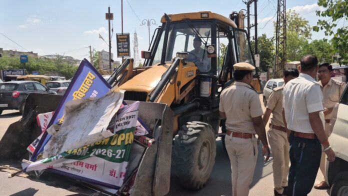 शहर में मुख्य चौराहों पर चला प्रशासन का बुलडोज़र, अवैध होर्डिंग्स और अस्थायी दुकानें हटायी — विजिबिलिटी सुधरने से हादसों पर लगेगा ब्रेक