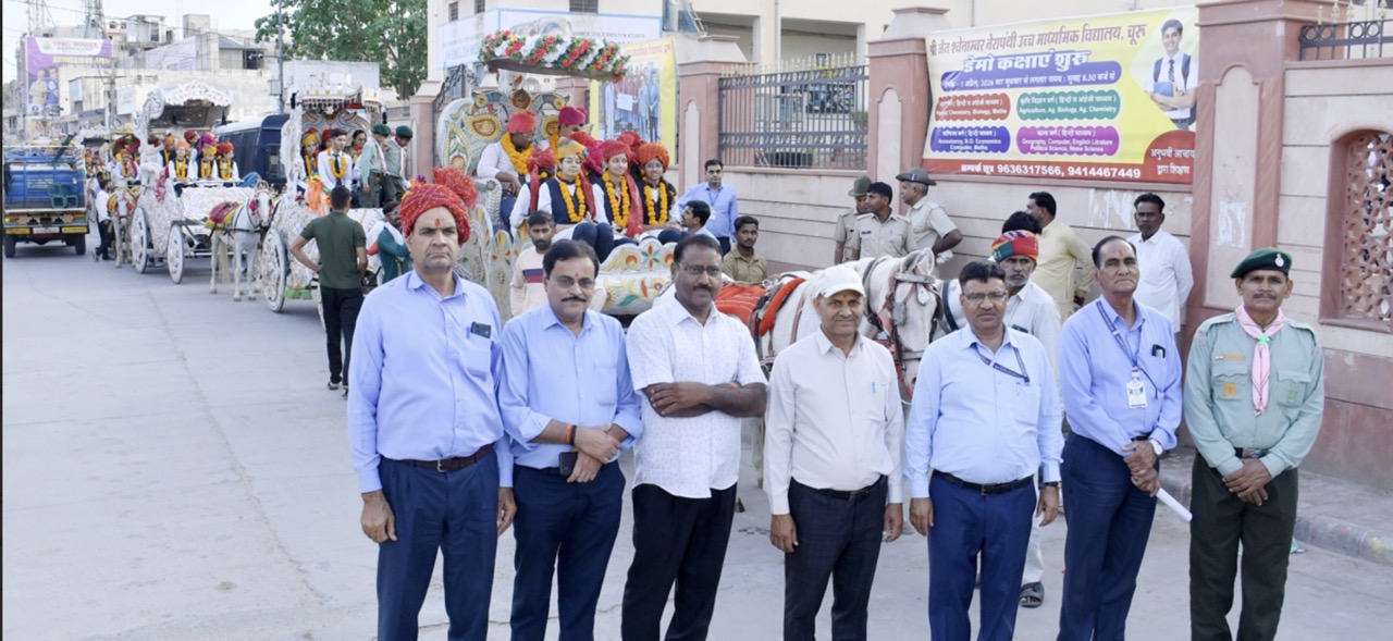 चूरू। श्री जैन श्वेताम्बर तेरापंथी बाल विहार विद्यालय परिसर स्थित बच्छावत ब्लॉक के हॉल में शैक्षणिक सत्र 2025-26 में कक्षा 10वीं एवं 12वीं में उत्कृष्ट प्रदर्शन करने वाले विद्यार्थियों के सम्मान में भव्य समारोह आयोजित किया गया। कार्यक्रम में अंग्रेजी एवं हिन्दी माध्यम के विद्यार्थियों ने उत्साहपूर्वक भाग लिया।समारोह में अंग्रेजी माध्यम के 90 प्रतिशत से अधिक अंक प्राप्त करने वाले 44 विद्यार्थियों एवं 85 प्रतिशत से अधिक अंक प्राप्त करने वाले 82 विद्यार्थियों के साथ ही हिन्दी माध्यम के 11 विद्यार्थियों को प्रधानाचार्य प्रेमसिंह राठौड़, हिन्दी माध्यम प्रधानाचार्य जगदीश प्रसाद जांगिड़, विद्यालय कार्यकारिणी समिति सदस्य अजय शर्मा, रविन्द्र सिंह शेखावत एवं लेखाकार सुरेश शर्मा द्वारा तिलक कर साफा पहनाकर सम्मानित किया गया।विद्यालय प्रधानाचार्य प्रेमसिंह राठौड़ ने बताया कि माध्यमिक शिक्षा बोर्ड, अजमेर द्वारा आयोजित कक्षा 10वीं एवं 12वीं बोर्ड परीक्षाओं में शानदार प्रदर्शन करने वाले कुल 92 विद्यार्थियों के सम्मान के लिए इस आयोजन का आयोजन किया गया।सम्मान समारोह के बाद विद्यार्थियों के लिए भव्य रैली का आयोजन किया गया। रैली में 11 सुसज्जित रथों एवं लगभग 15 वाहनों में विद्यार्थियों को बैठाकर शहर के प्रमुख मार्गों से निकाला गया। यह रैली विद्यालय से प्रारंभ होकर गढ़, सुभाष चौक, रेलवे स्टेशन एवं धर्मस्तूप होते हुए पुनः विद्यालय परिसर में सम्पन्न हुई।रैली के दौरान अंतरराष्ट्रीय ख्याति प्राप्त कलाकार आमिर बियानी के निर्देशन में आर. भारत ब्रास बैंड, सरदारशहर के दल द्वारा शानदार सांस्कृतिक प्रस्तुतियाँ दी गईं, जिसने शहरवासियों का ध्यान आकर्षित किया।प्रधानाचार्य राठौड़ ने बताया कि शिक्षा विभाग द्वारा तहसील स्तर पर जारी कक्षा 12वीं वाणिज्य वर्ग के श्रेष्ठ 11 विद्यार्थियों की सूची में से 10 विद्यार्थी इसी विद्यालय के हैं, जो विद्यालय की गुणवत्ता का प्रमाण है।विद्यालय न्यास के मुख्य न्यासी बसंत पारख, प्रबंध समिति अध्यक्ष डॉ. सूरजमल सुराणा एवं सचिव आनंद जी बालाण सहित अन्य न्यासियों ने इस आयोजन की सराहना करते हुए विद्यालय परिवार को बधाई दी।इस अवसर पर जगदीश प्रसाद धुओं, विजय शर्मा, घनश्याम शर्मा, भवानी सिंह, इंतजार अली, आदिल खान, सुनील शर्मा, महेश शर्मा, रचना कोठारी, कल्पना जांगिड़, ज्योति मेड़तिया सहित समस्त विद्यालय स्टाफ ने आयोजन को सफल बनाने में महत्वपूर्ण भूमिका निभाई।