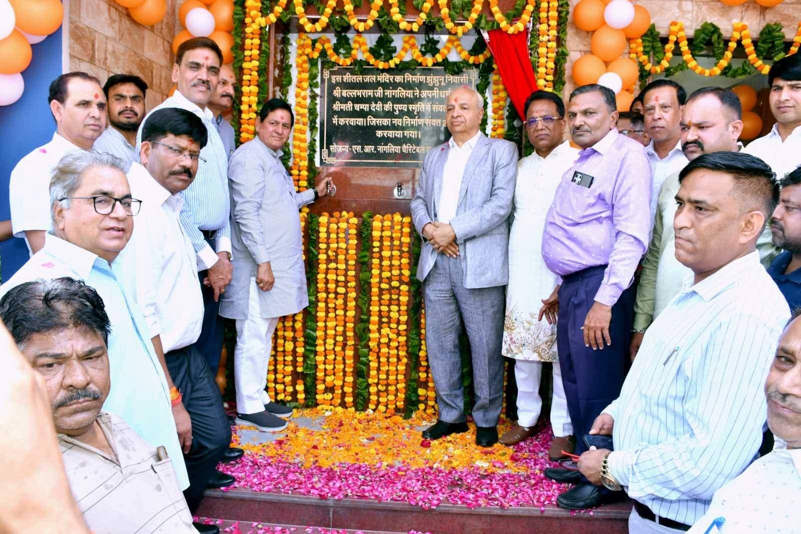 शहर के हृदय स्थल गांधी चौक स्थित ऐतिहासिक गांधी पार्क में शुक्रवार को सेवा, संस्कार और आधुनिकता का अद्भुत संगम देखने को मिला। ‘नांगलियाजी की प्याऊ’ के रूप में विख्यात शीतल जल मंदिर का आधुनिक तकनीक से कायाकल्प कर भव्य उद्घाटन किया गया। यह जल मंदिर स्व. चम्पा देवी नांगलिया की पावन स्मृति में एसआर नांगलिया चैरिटेबल ट्रस्ट, कोलकाता द्वारा पुनर्निर्मित कराया गया है। उद्घाटन समारोह से पूर्व संजू पंडित द्वारा विधिविधान से पूजा-अर्चना करवाई गई। इसके बाद झुंझुनूं विधायक राजेंद्र भाम्बू एवं जिला कलक्टर डॉ. अरुण गर्ग सहित अतिथियों ने फीता काटकर और शिलालेख पट्टिका का अनावरण कर इस हाई-टेक प्याऊ को आमजन को समर्पित किया।