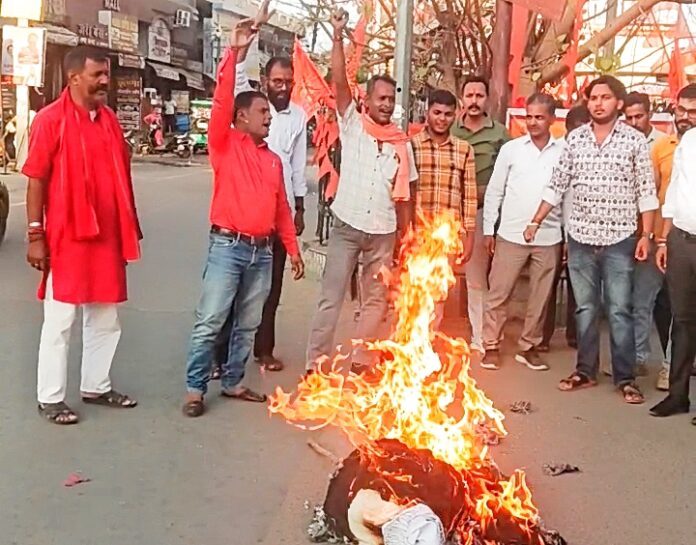 विश्व हिंदू परिषद (विहिप) के बैनर तले सोमवार को शहर के गांधी चौक पर धर्मांतरण और गौ हत्या के विरोध में जोरदार प्रदर्शन किया गया। जिला मंत्री जयराज हिंदू के नेतृत्व में कार्यकर्ताओं ने पुतला दहन कर अपना आक्रोश व्यक्त किया और सरकार से त्वरित कार्रवाई की मांग की। यह प्रदर्शन विहिप द्वारा चलाए जा रहे राष्ट्रव्यापी आंदोलन के तहत आयोजित किया गया, जिसमें बड़ी संख्या में कार्यकर्ताओं ने भाग लेते हुए नारेबाजी की और मुद्दों पर सख्त कानून लागू करने की मांग उठाई। जिला मंत्री जयराज हिंदू ने कहा कि देश में धर्मांतरण का एक संगठित रैकेट सक्रिय है, जिसे तत्काल समाप्त किया जाना चाहिए। उन्होंने गौ हत्या के मामलों पर भी चिंता जताते हुए राज्य सरकार से कठोर कदम उठाने का आग्रह किया। सह मंत्री प्रवीण कुमार शर्मा ने नरेंद्र मोदी के ‘बेटी बचाओ, बेटी पढ़ाओ’ अभियान का उल्लेख करते हुए कहा कि समाज को जागरूक करने के लिए इसमें ‘बेटी पढ़ाओ, लव जिहाद भगाओ’ जैसा नारा भी जोड़ा जाना चाहिए। प्रदर्शन में जिला संयोजक अंकित भीमसरिया, विधिक प्रकोष्ठ जिला अध्यक्ष एडवोकेट पंकज बावलिया, अखाड़ा प्रमुख विनय कुमावत, बजरंग दल नगर संयोजक मिलन शर्मा सहित अनेक कार्यकर्ता शामिल हुए।इसके अलावा नरेश तंवर, संजय स्वामी, पंकज सैनी, मोती टेलर, एडवोकेट ईशान मिश्रा, अनिल चोटिया, पंकज जांगिड़, सुनील शर्मा, लक्ष्मीकांत शर्मा, राकेश शर्मा, विपुल, धर्मेंद्र सिंह शेखावत, सतीश शर्मा, महेंद्र सैनी और वीरू पुजारी समेत कई कार्यकर्ताओं की उपस्थिति रही। प्रशासन से सख्त कार्रवाई की मांग – प्रदर्शनकारियों ने चेतावनी दी कि यदि धर्मांतरण और गौ हत्या पर प्रभावी रोक नहीं लगाई गई, तो आंदोलन को और तेज किया जाएगा। कार्यक्रम के दौरान पूरे क्षेत्र में सुरक्षा व्यवस्था भी मुस्तैद रही।